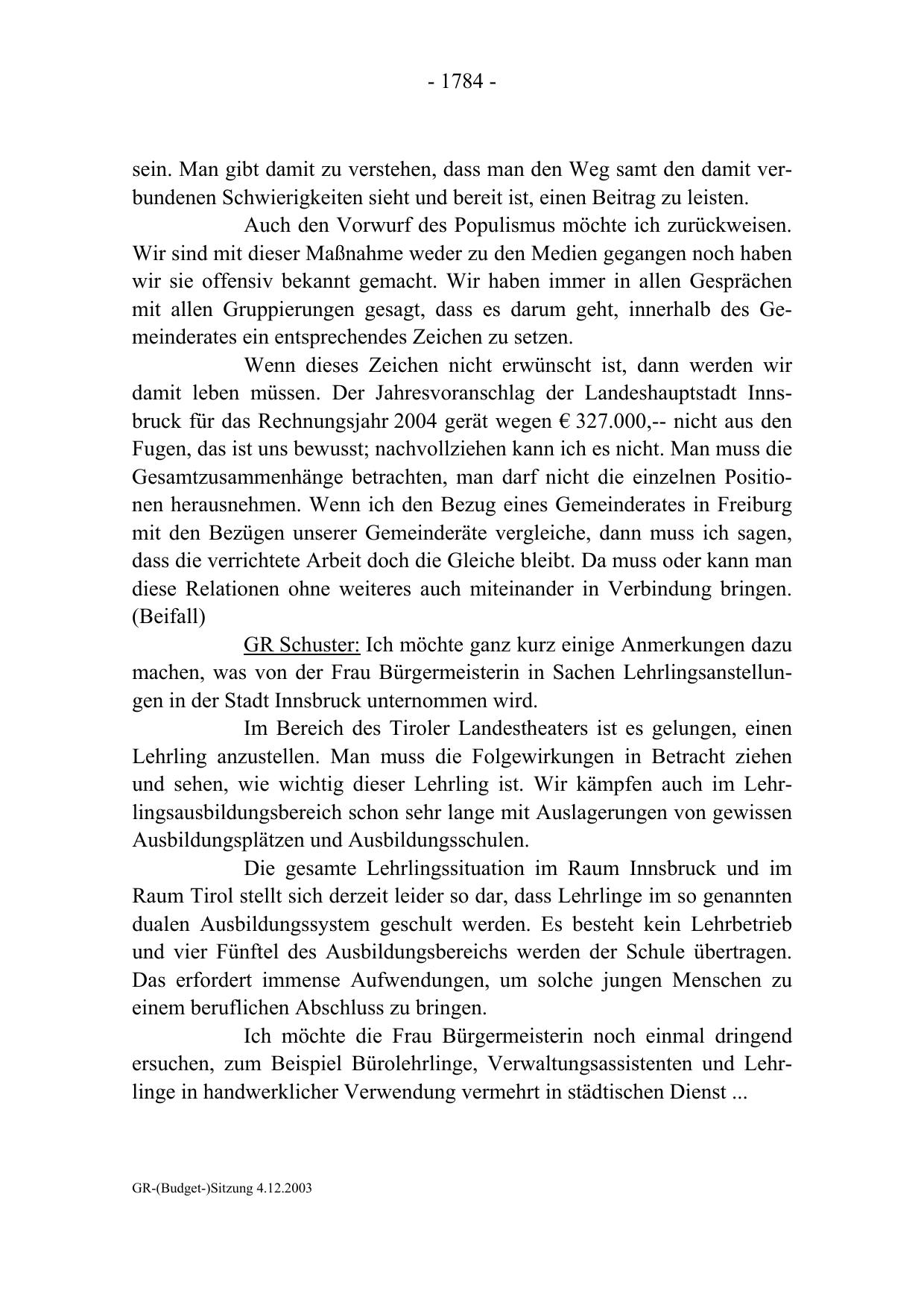 damit leben müssen. Der Jahresvoranschlag der Landeshauptstadt Innsbruck für das Rechnungsjahr 2004 gerät wegen € 327.000,-- nicht aus den