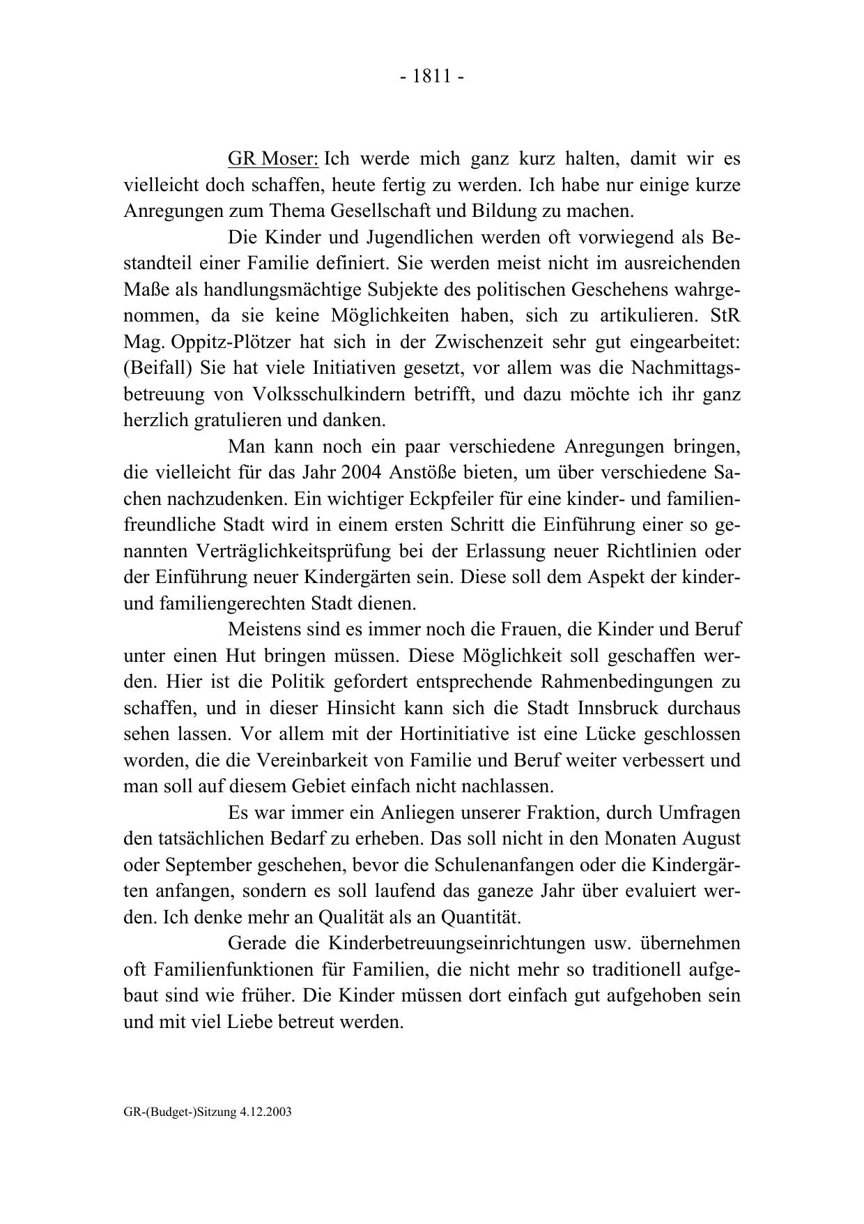 die vielleicht für das Jahr 2004 Anstöße bieten, um über verschiedene Sachen nachzudenken. Ein wichtiger Eckpfeiler für eine kinder- und familienfreundliche Stadt wird in einem ersten Schritt die Einführung einer so genannten Verträglichkeitsprüfung bei der Erlassung neuer Richtlinien oder