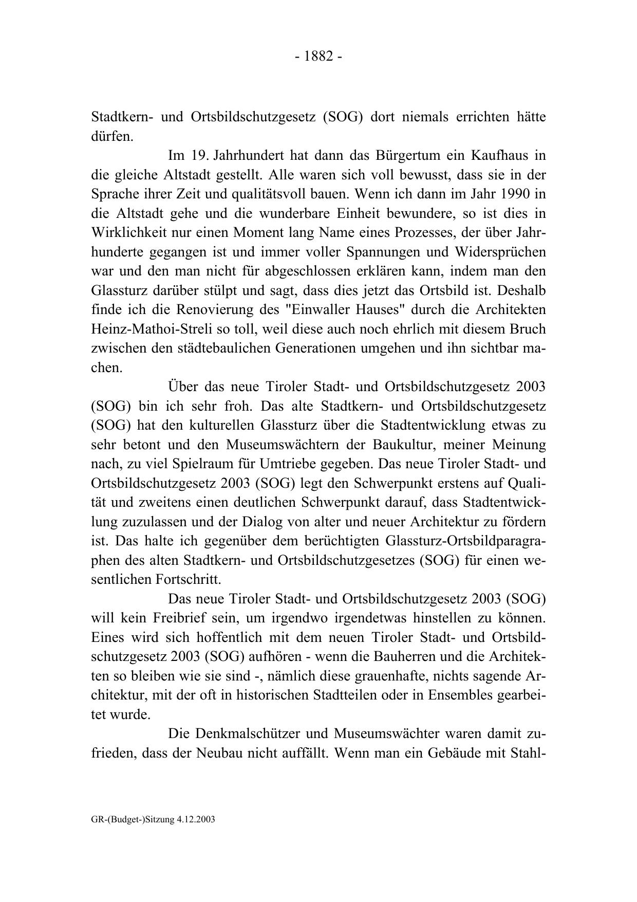 Eines wird sich hoffentlich mit dem neuen Tiroler Stadt- und Ortsbildschutzgesetz 2003 (SOG) aufhören - wenn die Bauherren und die Architekten so bleiben wie sie sind -, nämlich diese grauenhafte, nichts sagende Architektur, mit der oft in historischen Stadtteilen oder in Ensembles gearbeitet wurde.