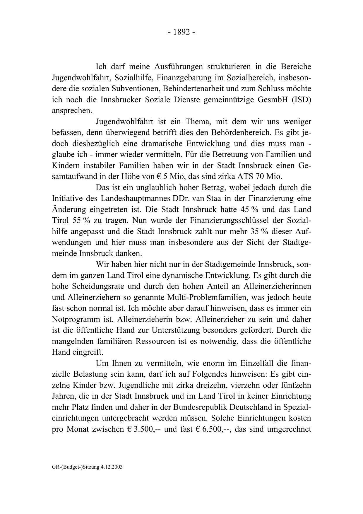 Kindern instabiler Familien haben wir in der Stadt Innsbruck einen Gesamtaufwand in der Höhe von € 5 Mio, das sind zirka ATS 70 Mio.