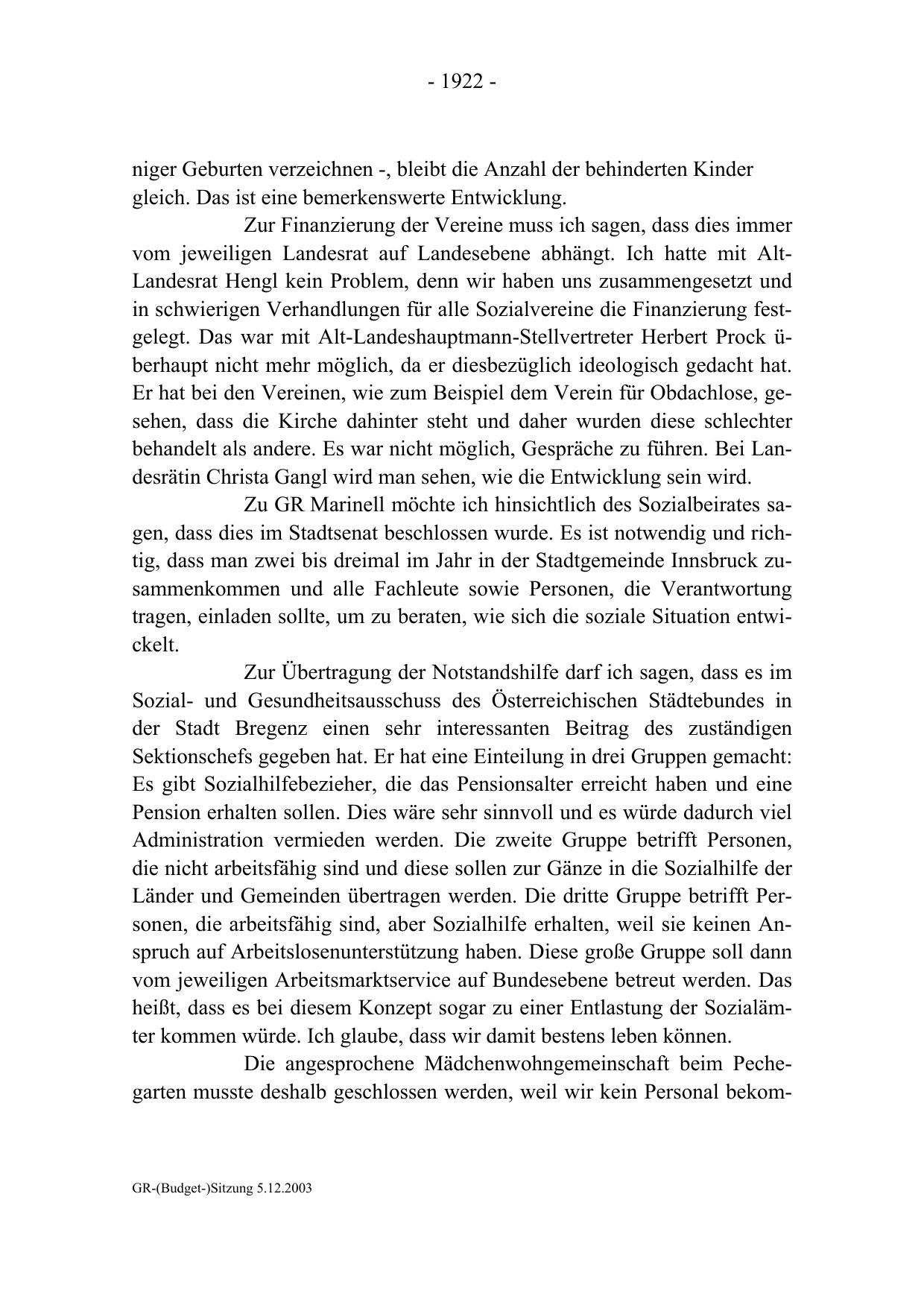 Zu GR Marinell möchte ich hinsichtlich des Sozialbeirates sagen, dass dies im Stadtsenat beschlossen wurde. Es ist notwendig und richtig, dass man zwei bis dreimal im Jahr in der Stadtgemeinde Innsbruck zusammenkommen und alle Fachleute sowie Personen, die Verantwortung