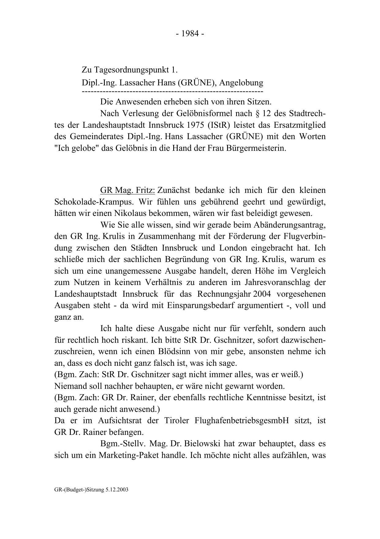 Nach Verlesung der Gelöbnisformel nach § 12 des Stadtrechtes der Landeshauptstadt Innsbruck 1975 (IStR) leistet das Ersatzmitglied