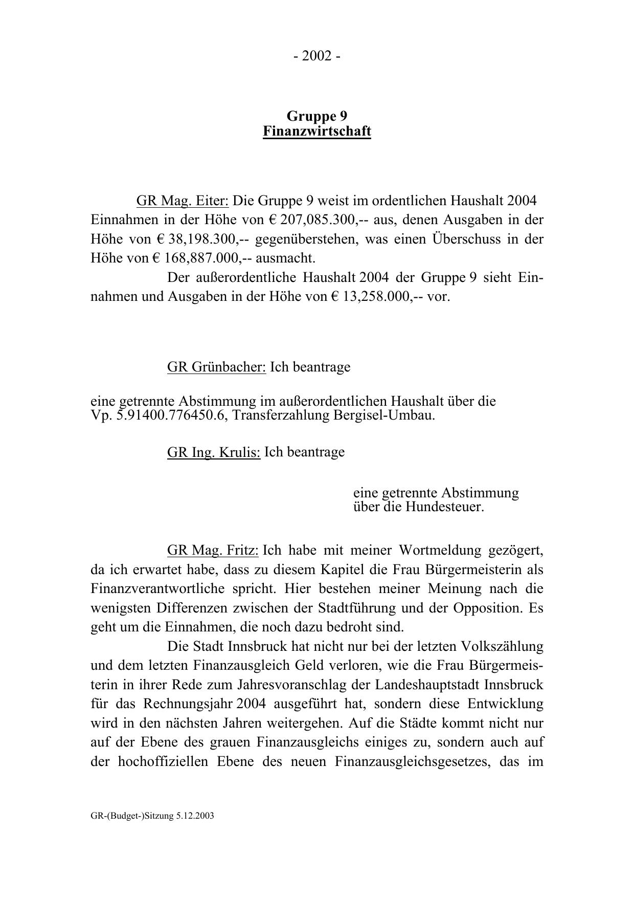 GR-(Budget-)Sitzung 5.12.2003