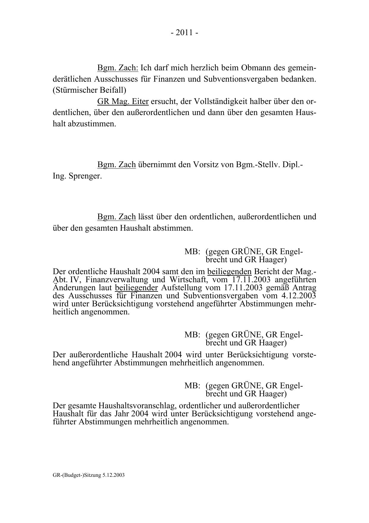 Haushalt für das Jahr 2004 wird unter Berücksichtigung vorstehend angeführter Abstimmungen mehrheitlich angenommen.