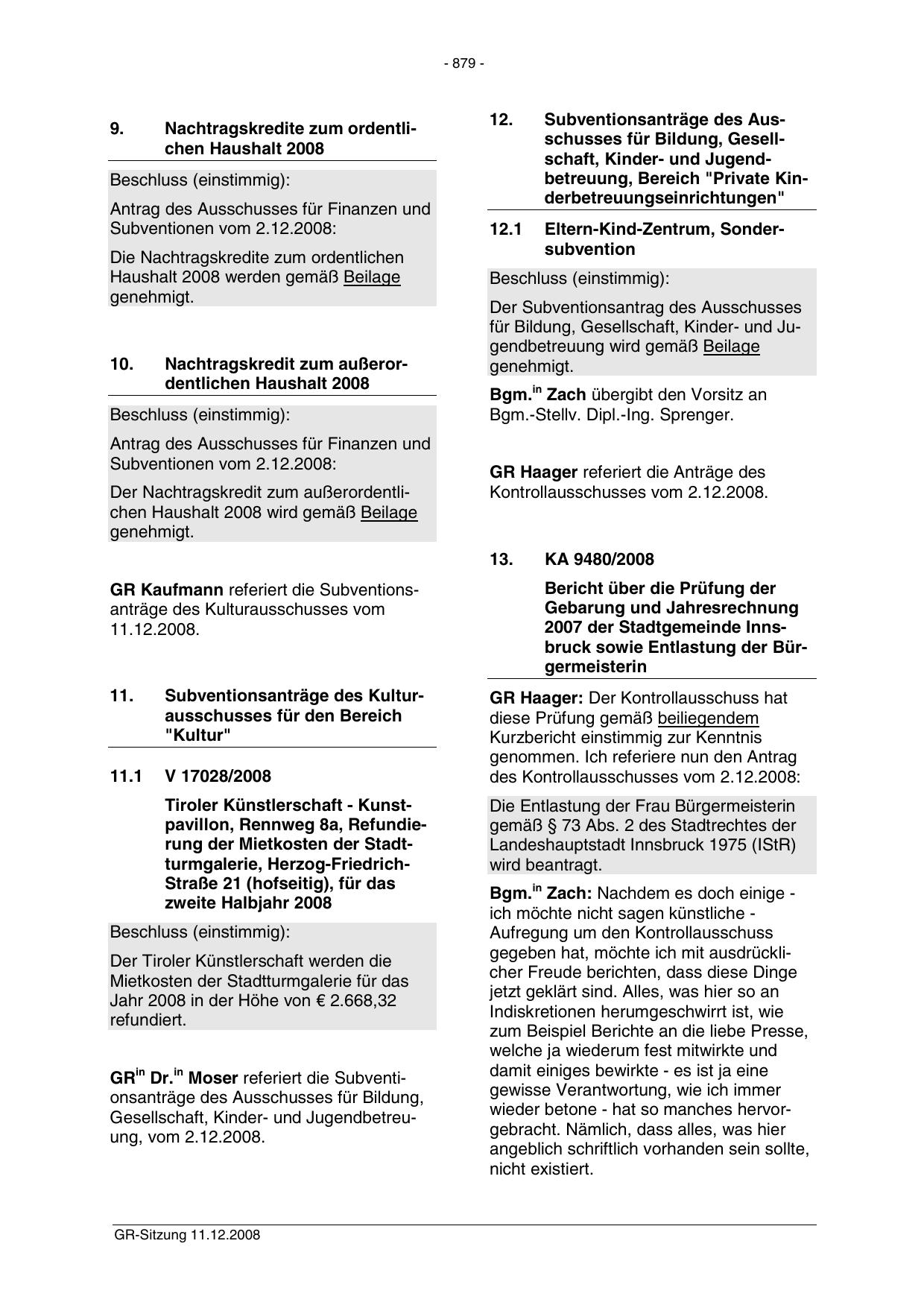 2007 der Stadtgemeinde Innsbruck sowie Entlastung der Bürgermeisterin