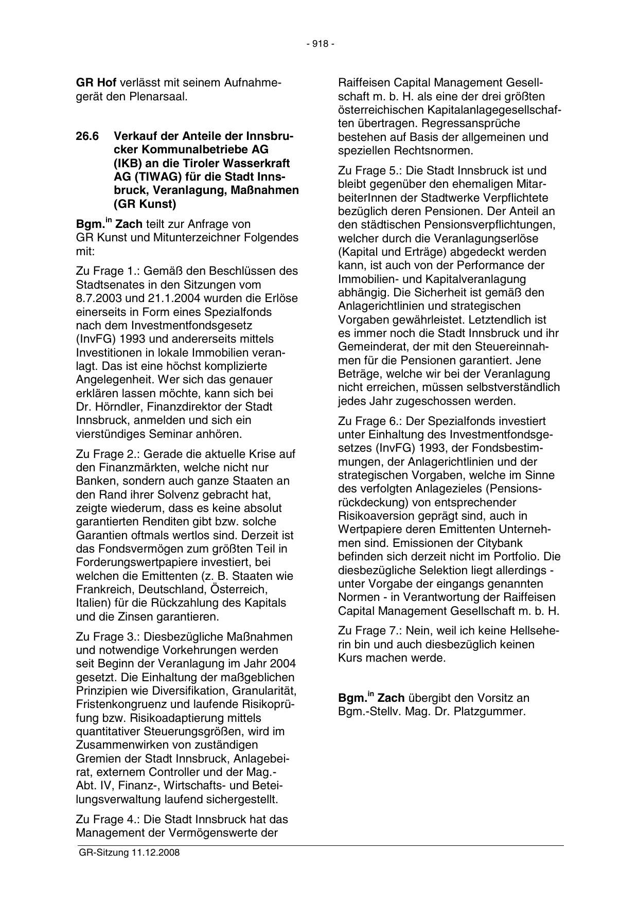 Gremien der Stadt Innsbruck, Anlagebeirat, externem Controller und der Mag.Abt. IV, Finanz-, Wirtschafts- und Beteilungsverwaltung laufend sichergestellt.