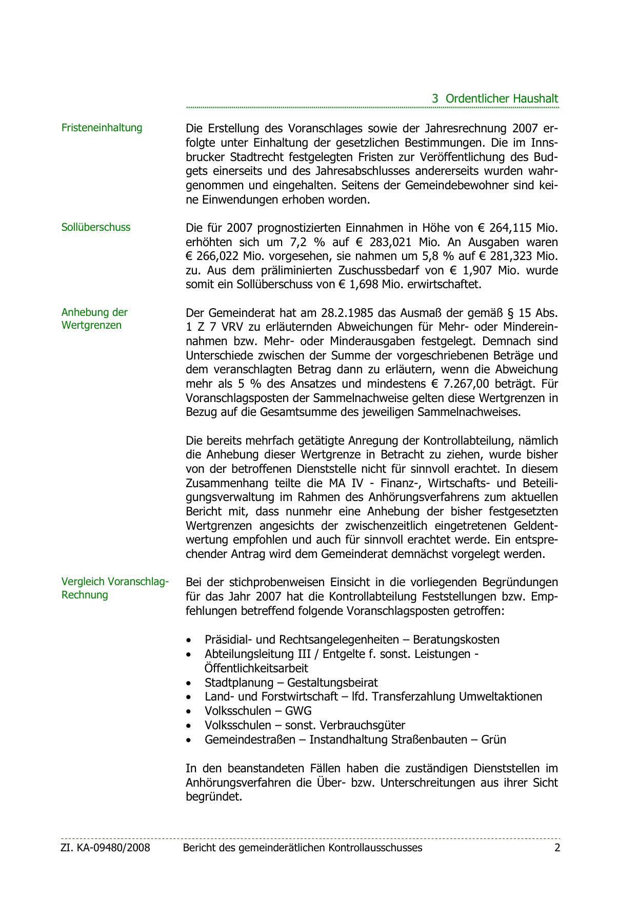 Die Erstellung des Voranschlages sowie der Jahresrechnung 2007 erfolgte unter Einhaltung der gesetzlichen Bestimmungen. Die im Innsbrucker Stadtrecht festgelegten Fristen zur Veröffentlichung des Budgets einerseits und des Jahresabschlusses andererseits wurden wahrgenommen und eingehalten. Seitens der Gemeindebewohner sind keine Einwendungen erhoben worden.