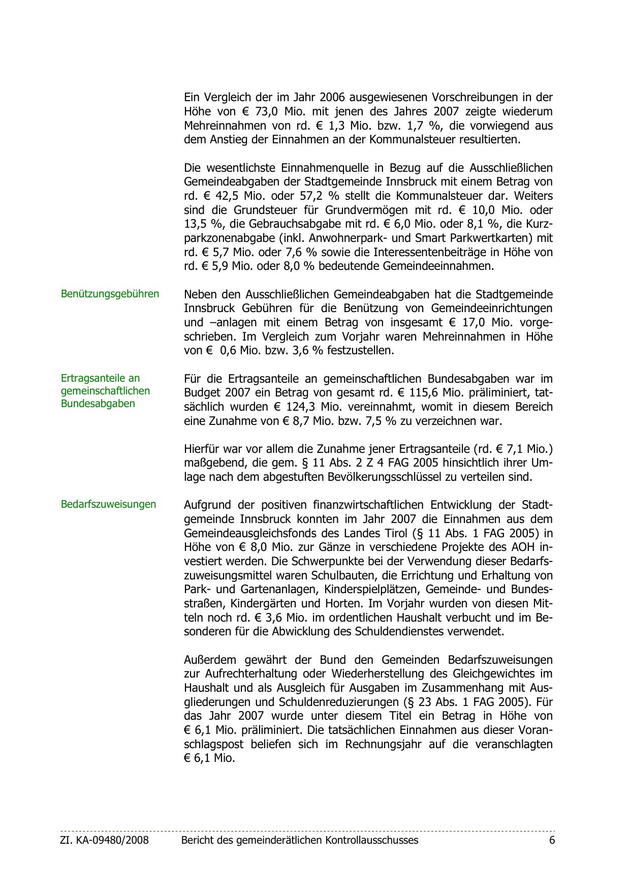 Aufgrund der positiven finanzwirtschaftlichen Entwicklung der Stadtgemeinde Innsbruck konnten im Jahr 2007 die Einnahmen aus dem