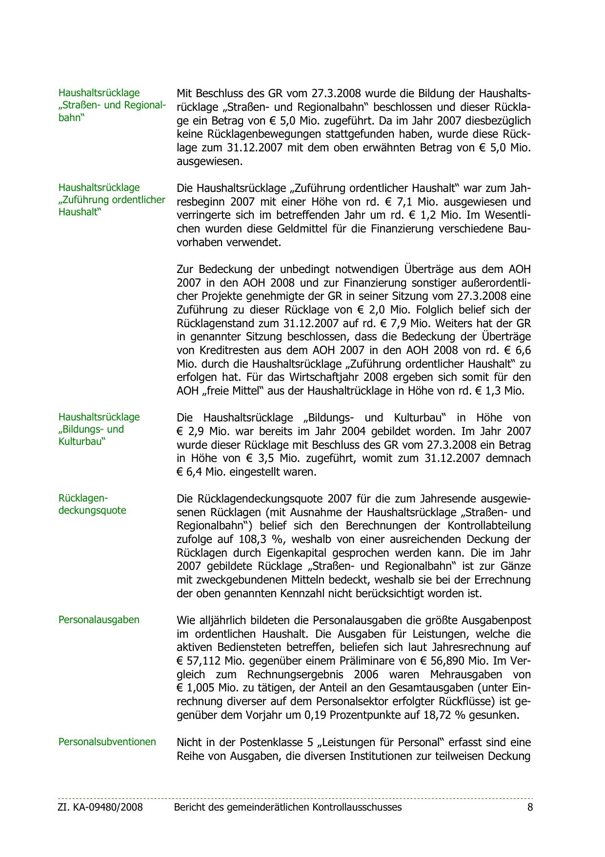 Rücklagenstand zum 31.12.2007 auf rd. € 7,9 Mio. Weiters hat der GR