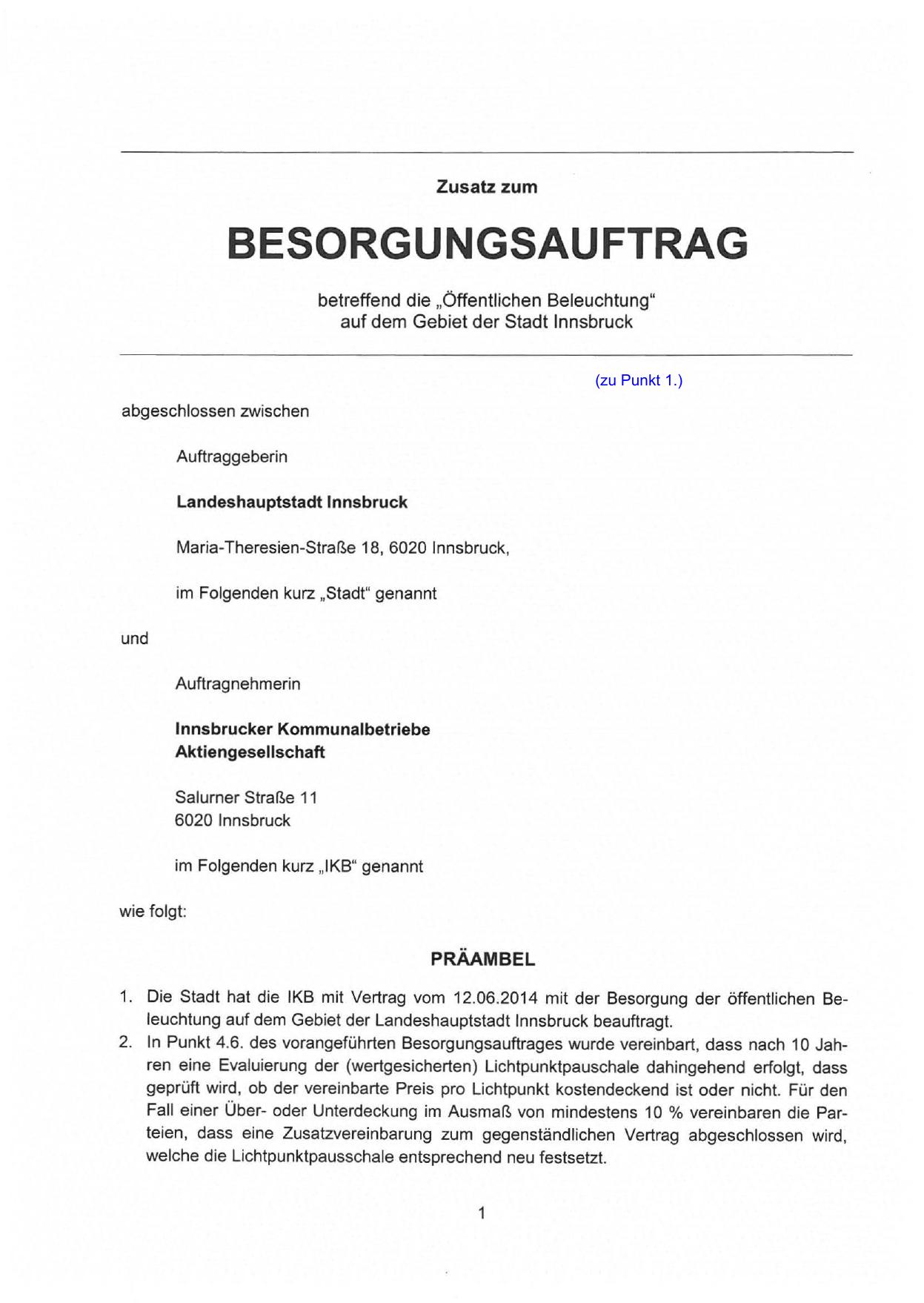 1. Die Stadt hat die IKB mit Vertrag vom 12.06.2014 mit der Besorgung der öffentlichen Beleuchtung auf dem Gebiet der Landeshauptstadt Innsbruck beauftragt.