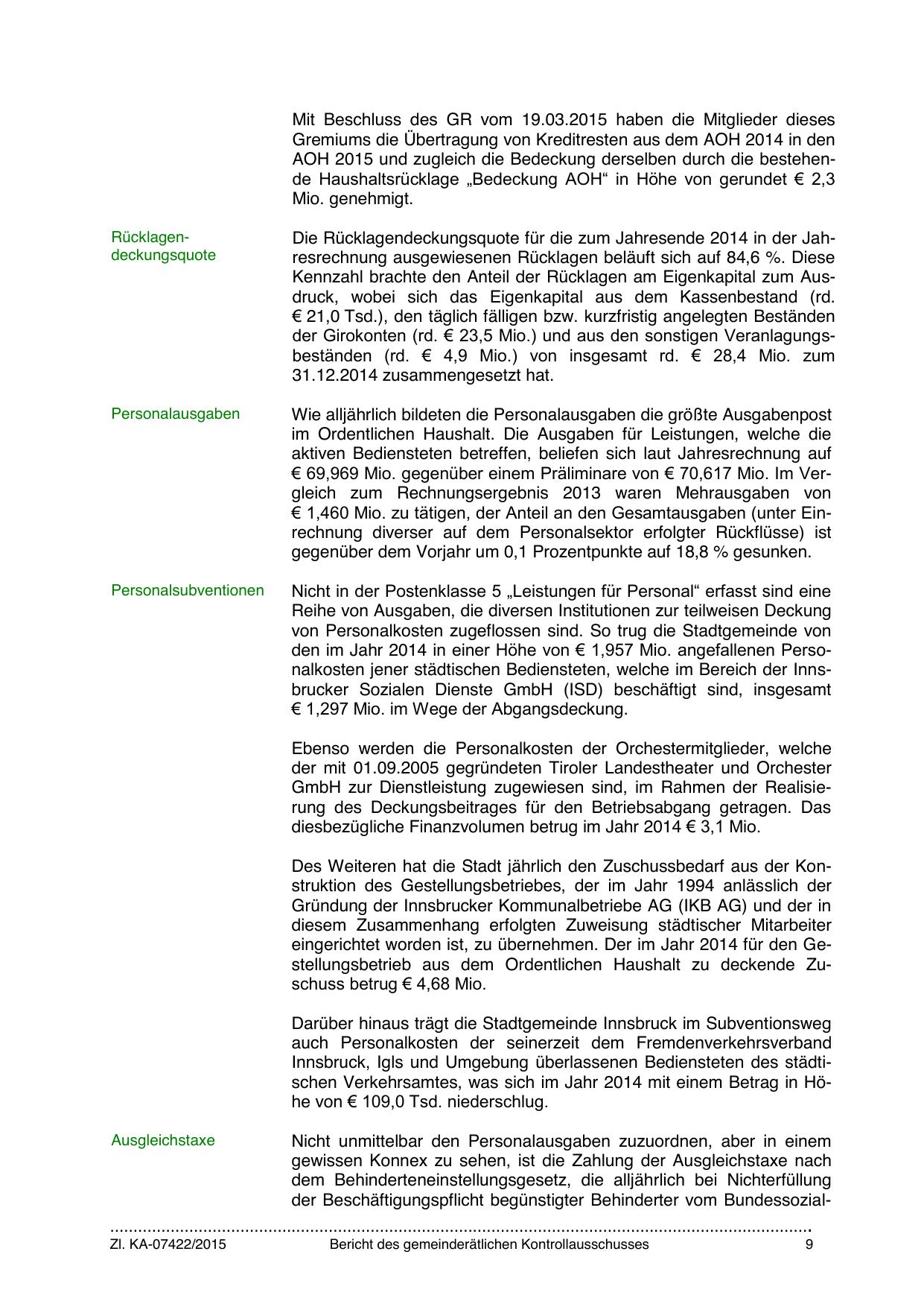 den im Jahr 2014 in einer Höhe von € 1,957 Mio. angefallenen Personalkosten jener städtischen Bediensteten, welche im Bereich der Innsbrucker Sozialen Dienste GmbH (ISD) beschäftigt sind, insgesamt