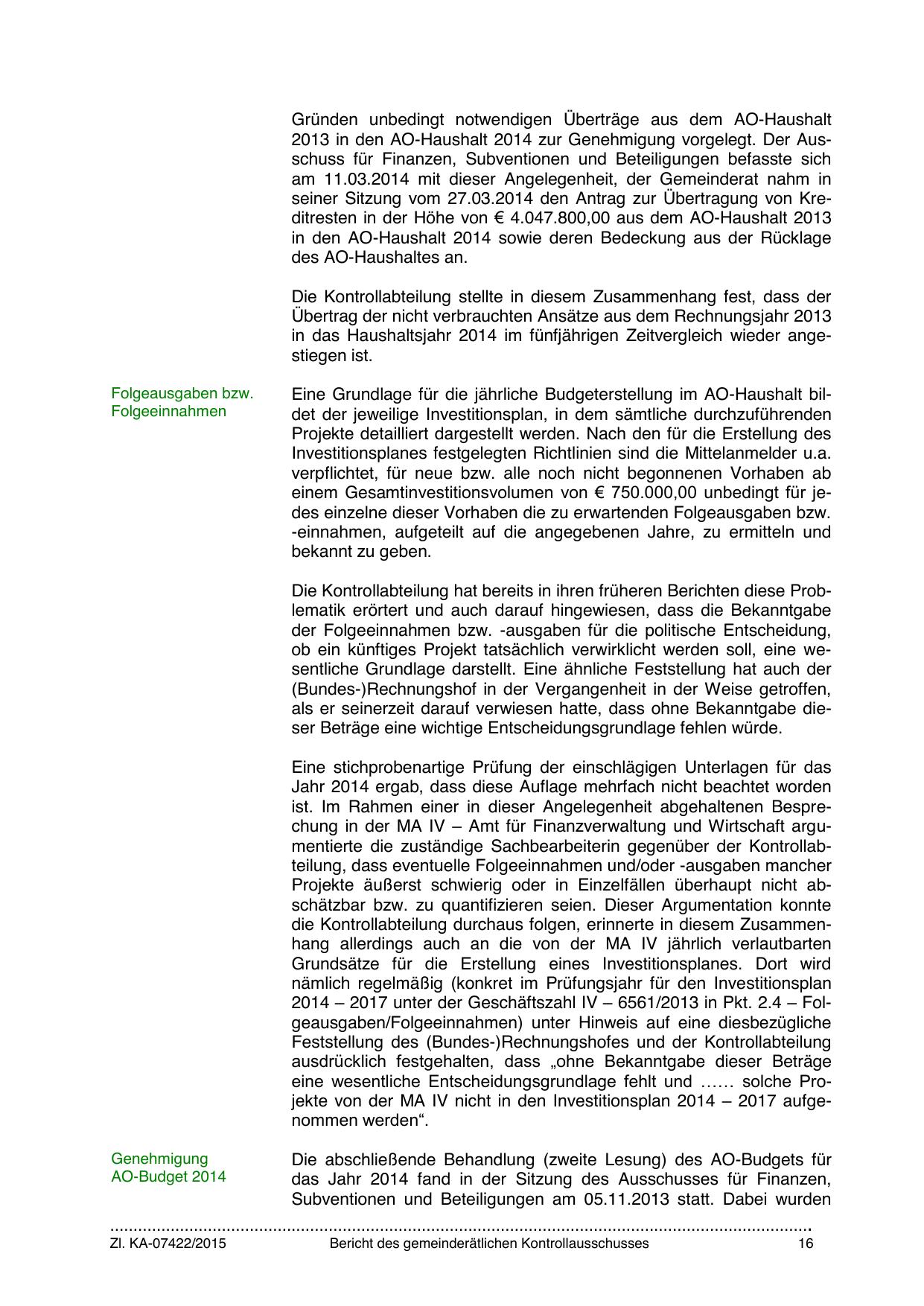 2014 – 2017 unter der Geschäftszahl IV – 6561/2013 in Pkt. 2.4 – Folgeausgaben/Folgeeinnahmen) unter Hinweis auf eine diesbezügliche