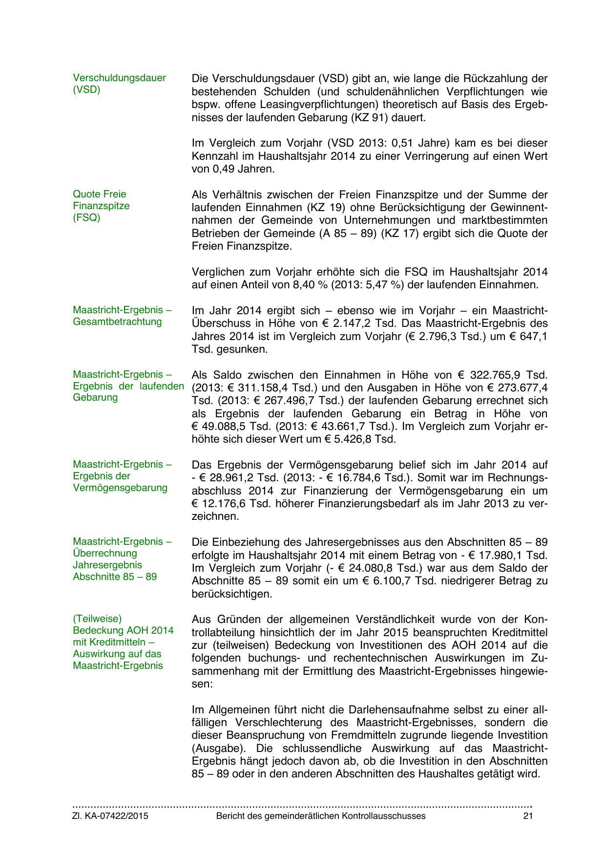 Im Jahr 2014 ergibt sich – ebenso wie im Vorjahr – ein MaastrichtÜberschuss in Höhe von € 2.147,2 Tsd. Das Maastricht-Ergebnis des