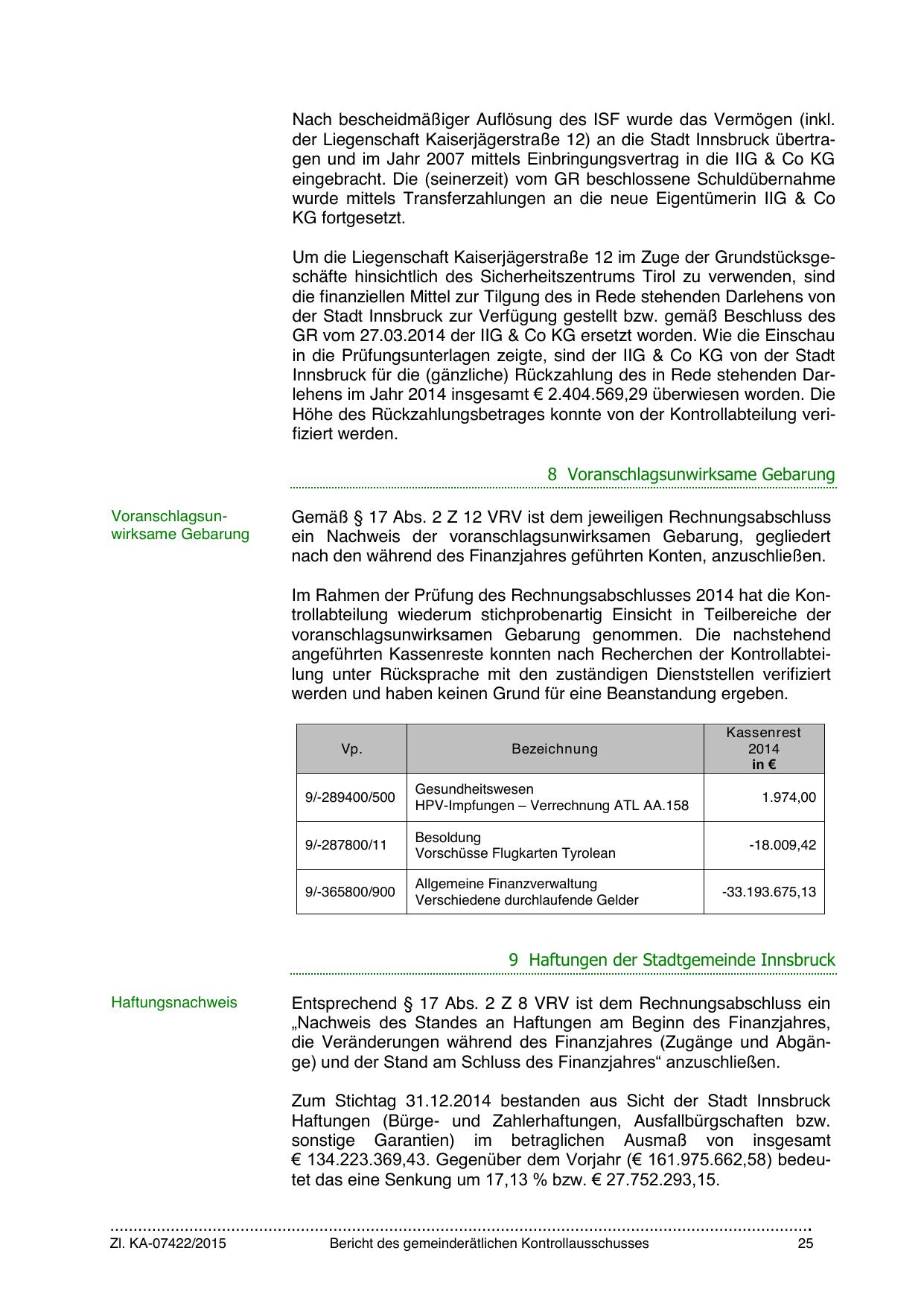 Zum Stichtag 31.12.2014 bestanden aus Sicht der Stadt Innsbruck