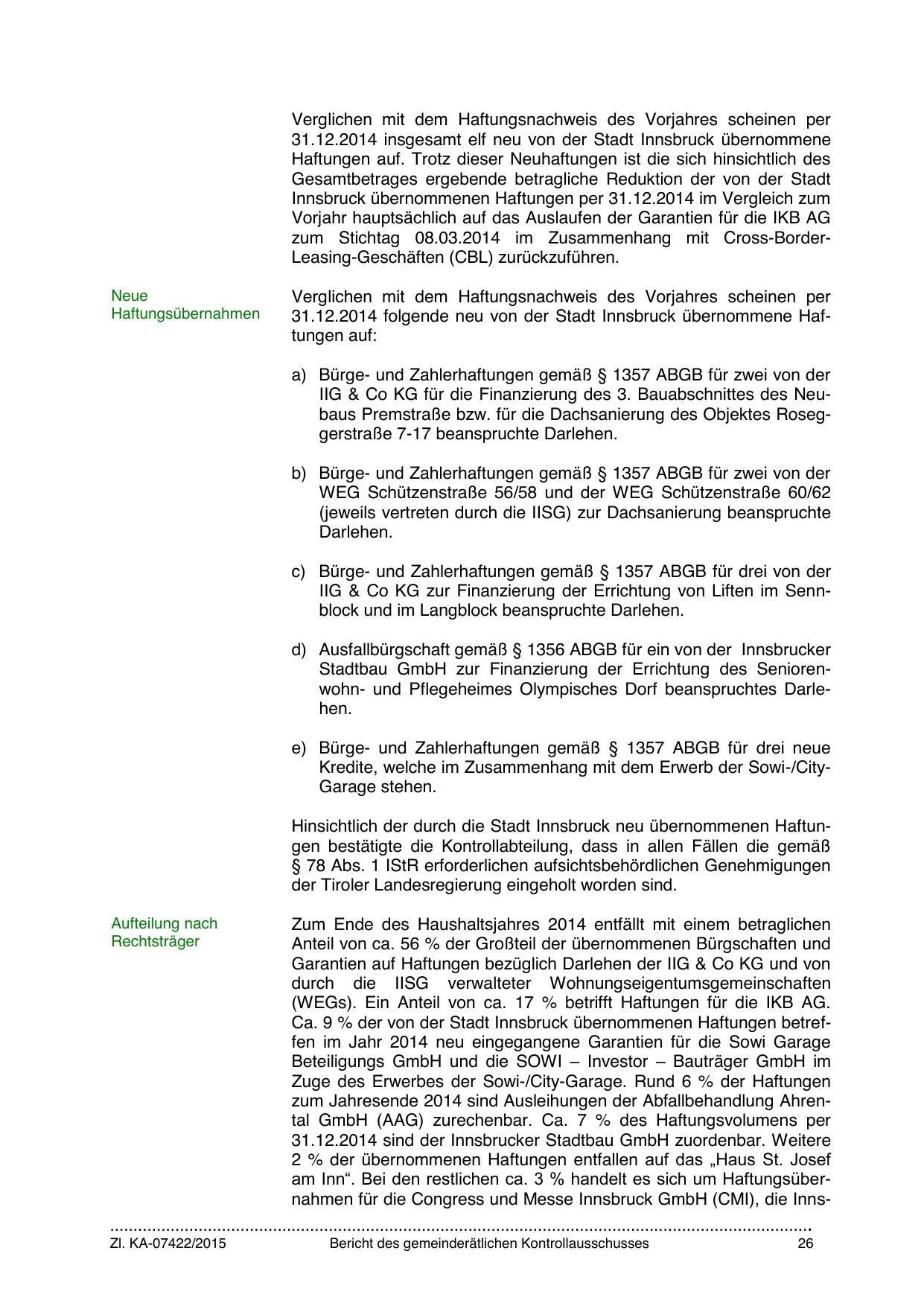 31.12.2014 folgende neu von der Stadt Innsbruck übernommene Haftungen auf: