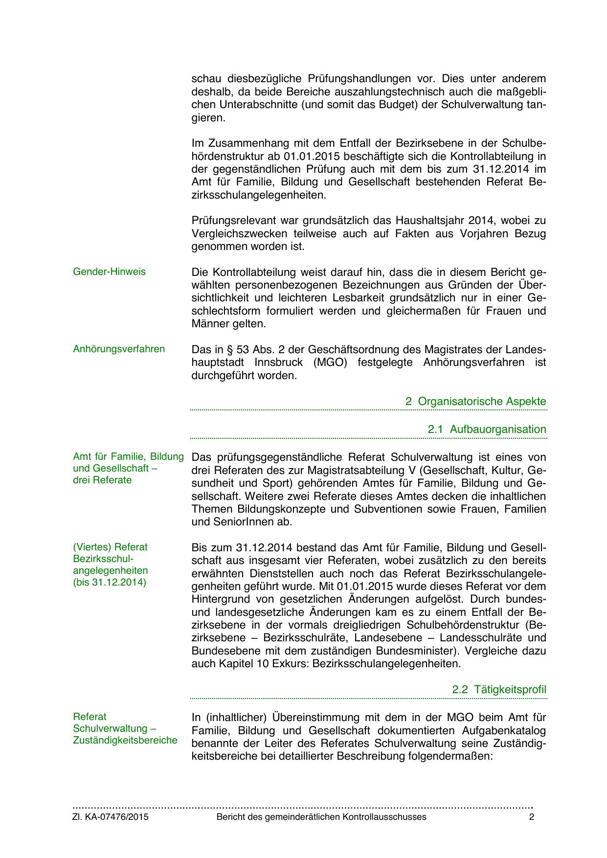 Im Zusammenhang mit dem Entfall der Bezirksebene in der Schulbehördenstruktur ab 01.01.2015 beschäftigte sich die Kontrollabteilung in