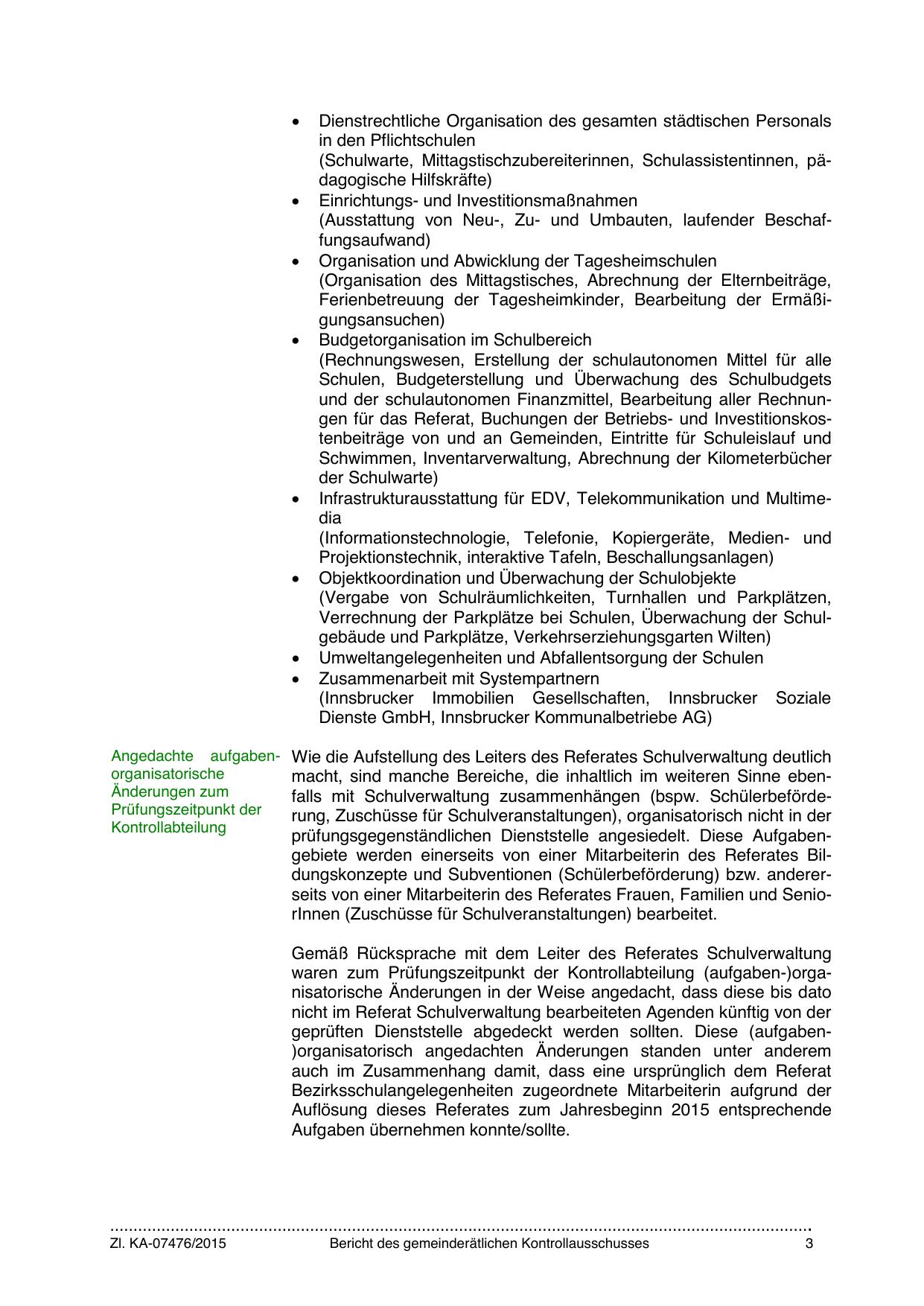 prüfungsgegenständlichen Dienststelle angesiedelt. Diese Aufgabengebiete werden einerseits von einer Mitarbeiterin des Referates Bildungskonzepte und Subventionen (Schülerbeförderung) bzw. andererseits von einer Mitarbeiterin des Referates Frauen, Familien und SeniorInnen (Zuschüsse für Schulveranstaltungen) bearbeitet.