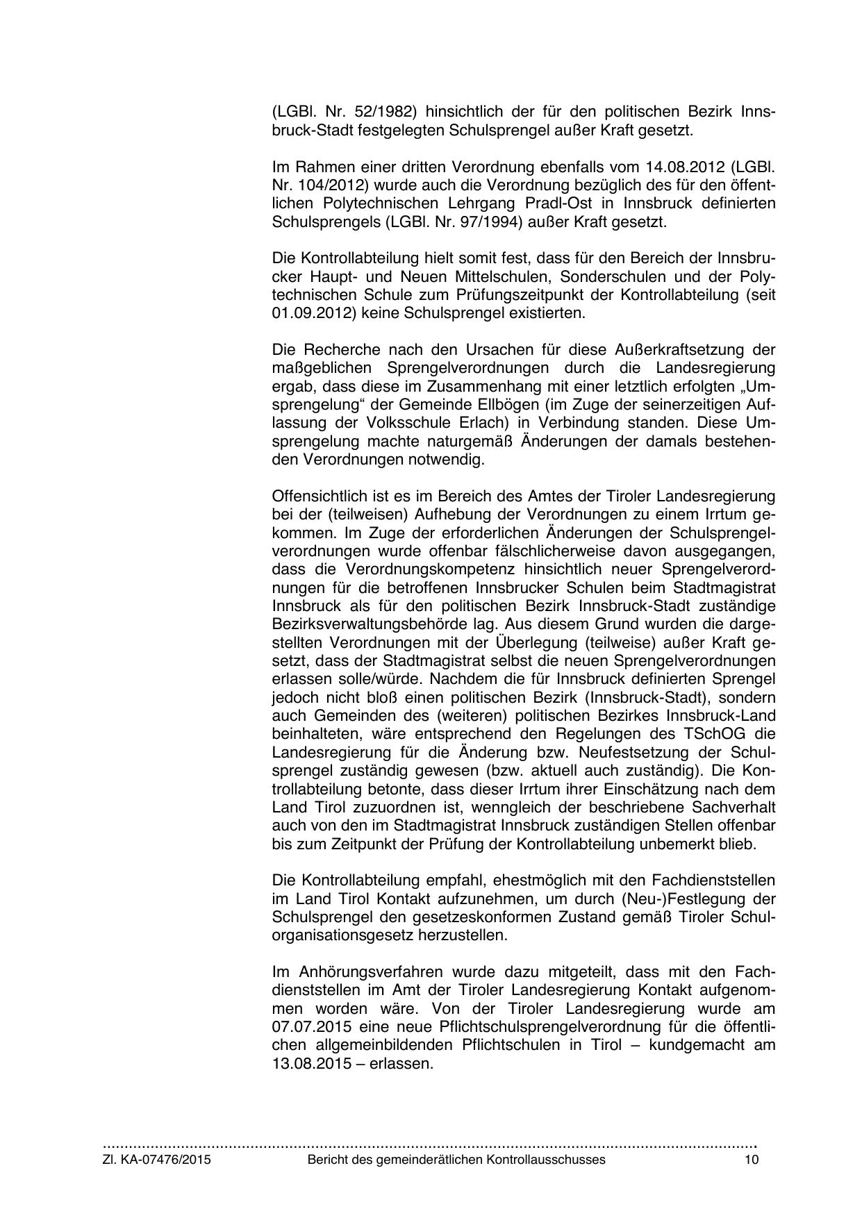 Landesregierung für die Änderung bzw. Neufestsetzung der Schulsprengel zuständig gewesen (bzw. aktuell auch zuständig). Die Kontrollabteilung betonte, dass dieser Irrtum ihrer Einschätzung nach dem