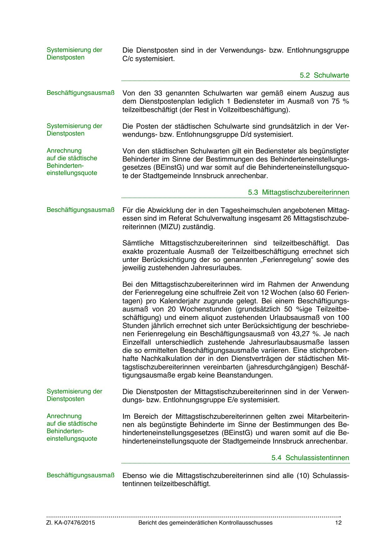 Im Bereich der Mittagstischzubereiterinnen gelten zwei Mitarbeiterinnen als begünstigte Behinderte im Sinne der Bestimmungen des Behinderteneinstellungsgesetzes (BEinstG) und waren somit auf die Behinderteneinstellungsquote der Stadtgemeinde Innsbruck anrechenbar.