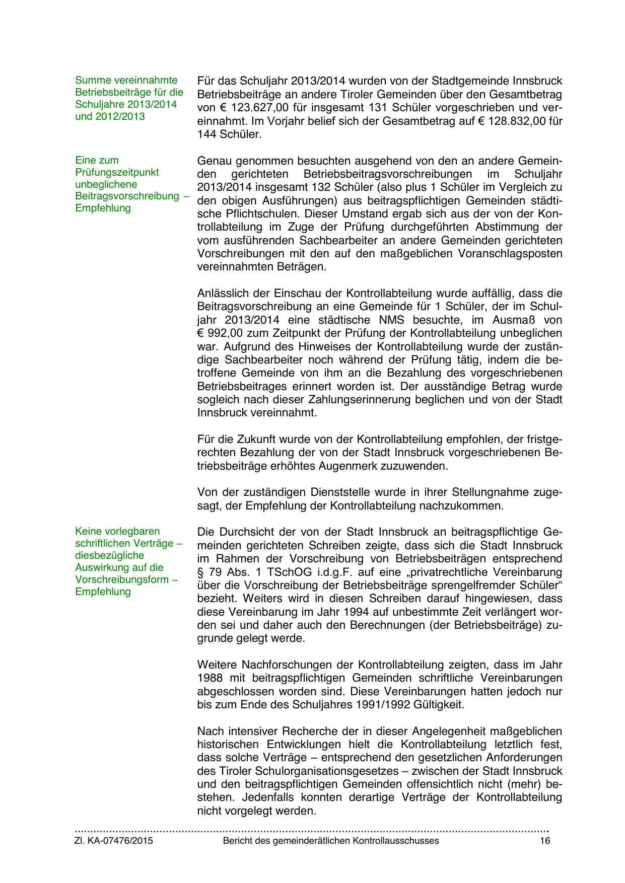 Für die Zukunft wurde von der Kontrollabteilung empfohlen, der fristgerechten Bezahlung der von der Stadt Innsbruck vorgeschriebenen Betriebsbeiträge erhöhtes Augenmerk zuzuwenden.