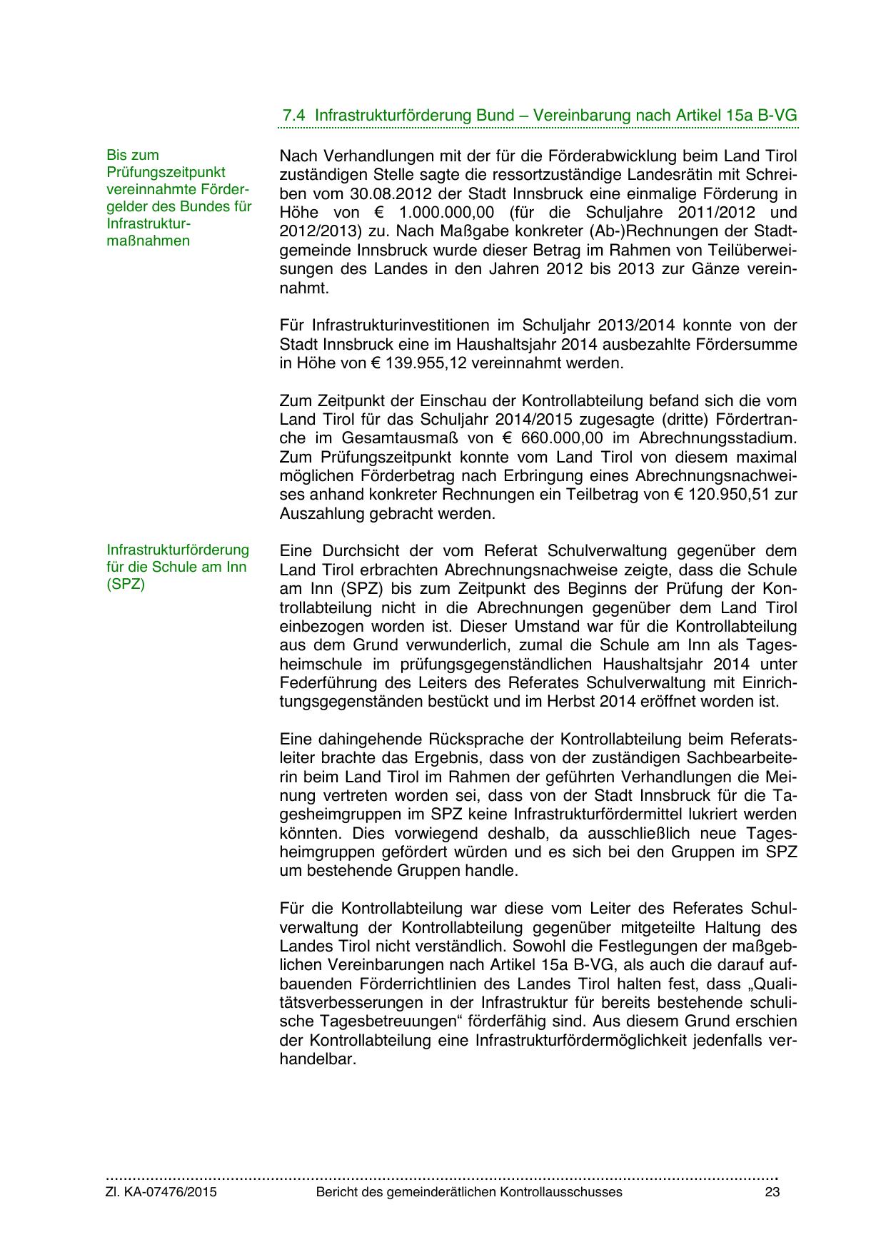 Eine dahingehende Rücksprache der Kontrollabteilung beim Referatsleiter brachte das Ergebnis, dass von der zuständigen Sachbearbeiterin beim Land Tirol im Rahmen der geführten Verhandlungen die Meinung vertreten worden sei, dass von der Stadt Innsbruck für die Tagesheimgruppen im SPZ keine Infrastrukturfördermittel lukriert werden