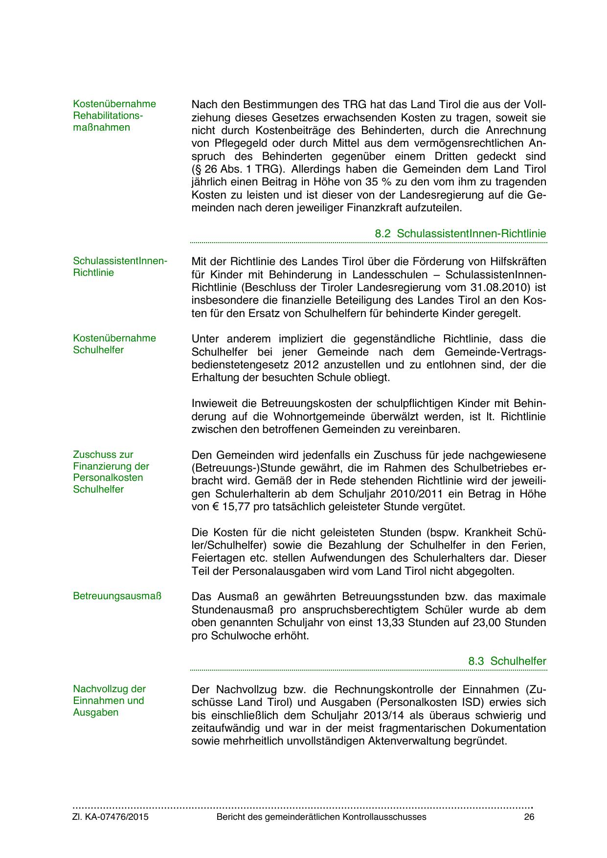 insbesondere die finanzielle Beteiligung des Landes Tirol an den Kosten für den Ersatz von Schulhelfern für behinderte Kinder geregelt.