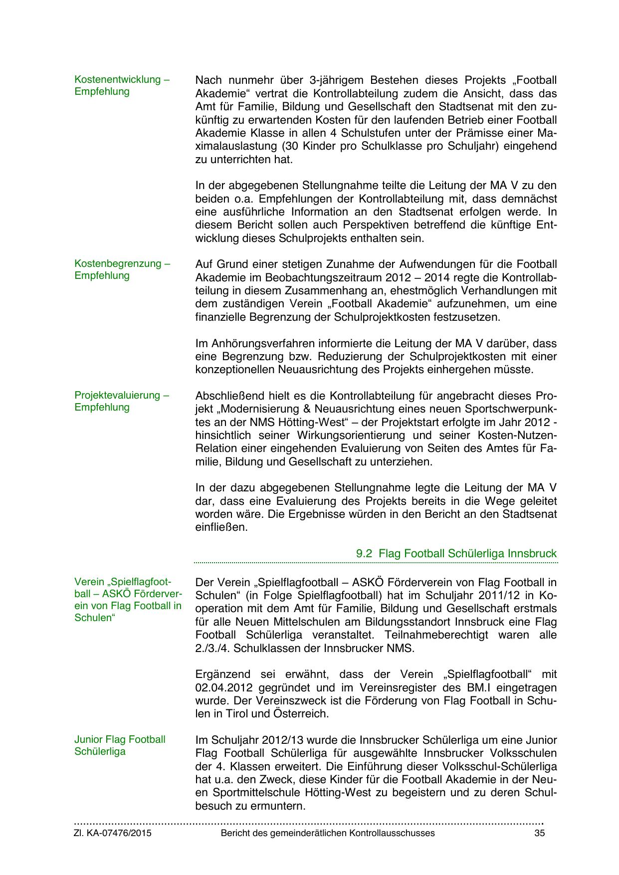 Abschließend hielt es die Kontrollabteilung für angebracht dieses Projekt „Modernisierung & Neuausrichtung eines neuen Sportschwerpunktes an der NMS Hötting-West“ – der Projektstart erfolgte im Jahr 2012 hinsichtlich seiner Wirkungsorientierung und seiner Kosten-NutzenRelation einer eingehenden Evaluierung von Seiten des Amtes für Familie, Bildung und Gesellschaft zu unterziehen.