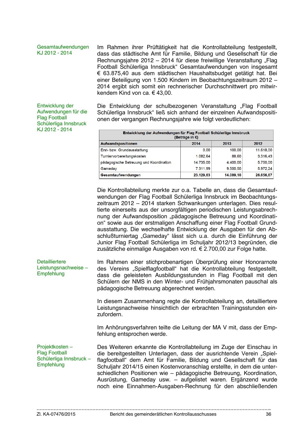 Die Kontrollabteilung merkte zur o.a. Tabelle an, dass die Gesamtaufwendungen der Flag Football Schülerliga Innsbruck im Beobachtungszeitraum 2012 – 2014 starken Schwankungen unterlagen. Dies resultierte einerseits aus der unsorgfältigen periodischen Leistungsabrechnung der Aufwandsposition „pädagogische Betreuung und Koordination“ sowie aus der erstmaligen Anschaffung einer Flag Football Grundausstattung. Die wechselhafte Entwicklung der Ausgaben für den Abschlußturniertag „Gameday“ lässt sich u.a. durch die Einführung der