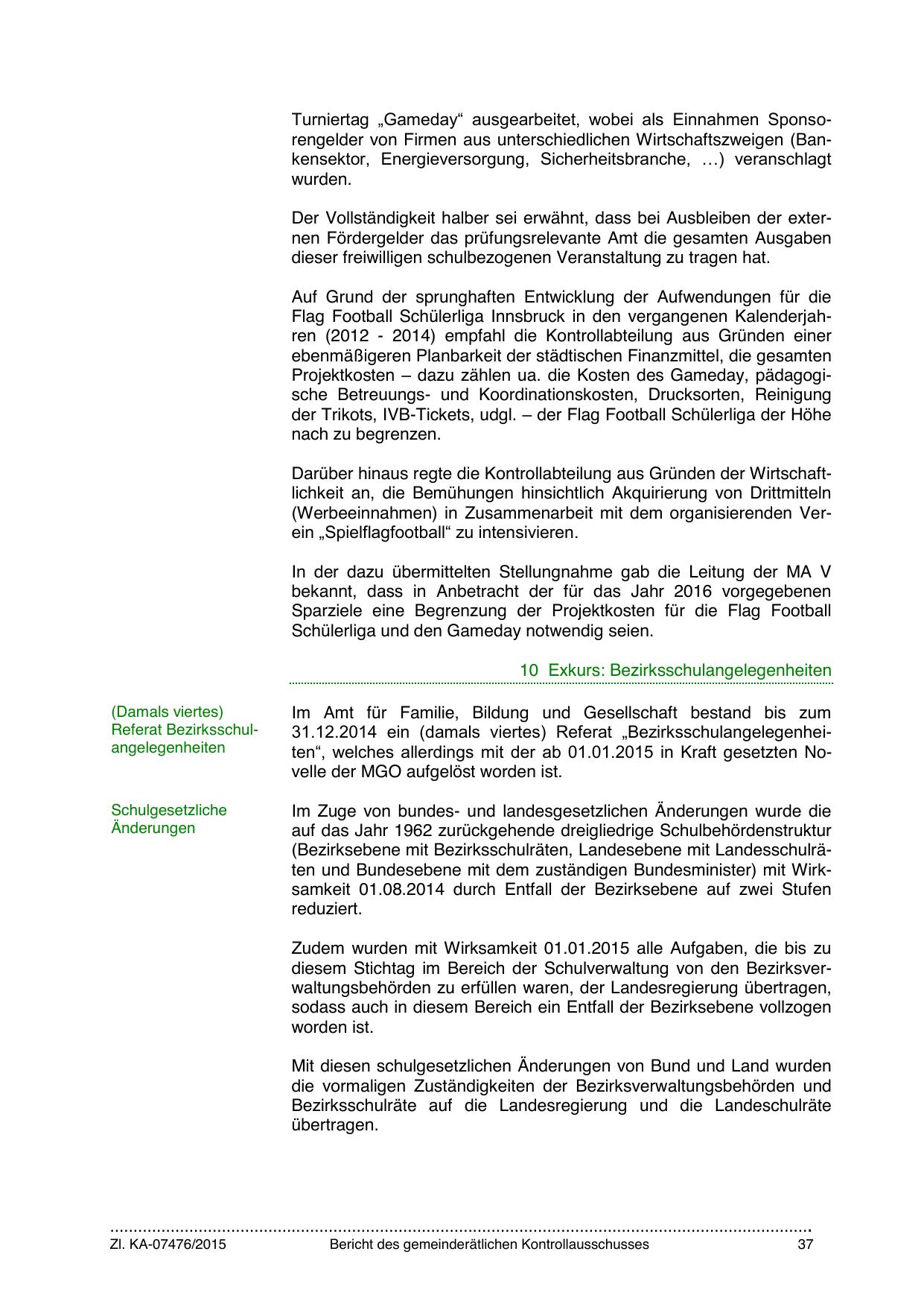 Flag Football Schülerliga Innsbruck in den vergangenen Kalenderjahren (2012 - 2014) empfahl die Kontrollabteilung aus Gründen einer