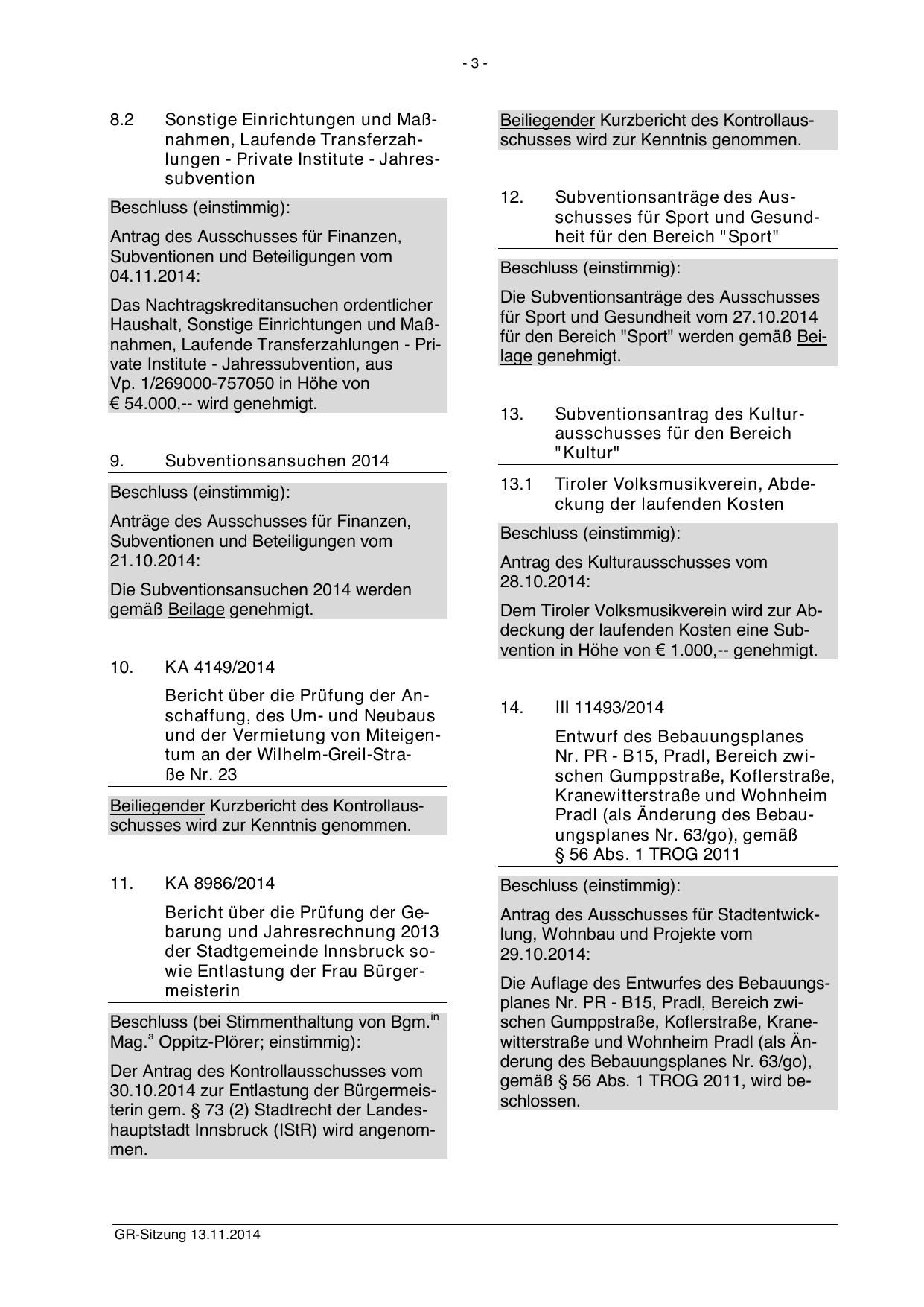30.10.2014 zur Entlastung der Bürgermeisterin gem. § 73 (2) Stadtrecht der Landeshauptstadt Innsbruck (IStR) wird angenommen.