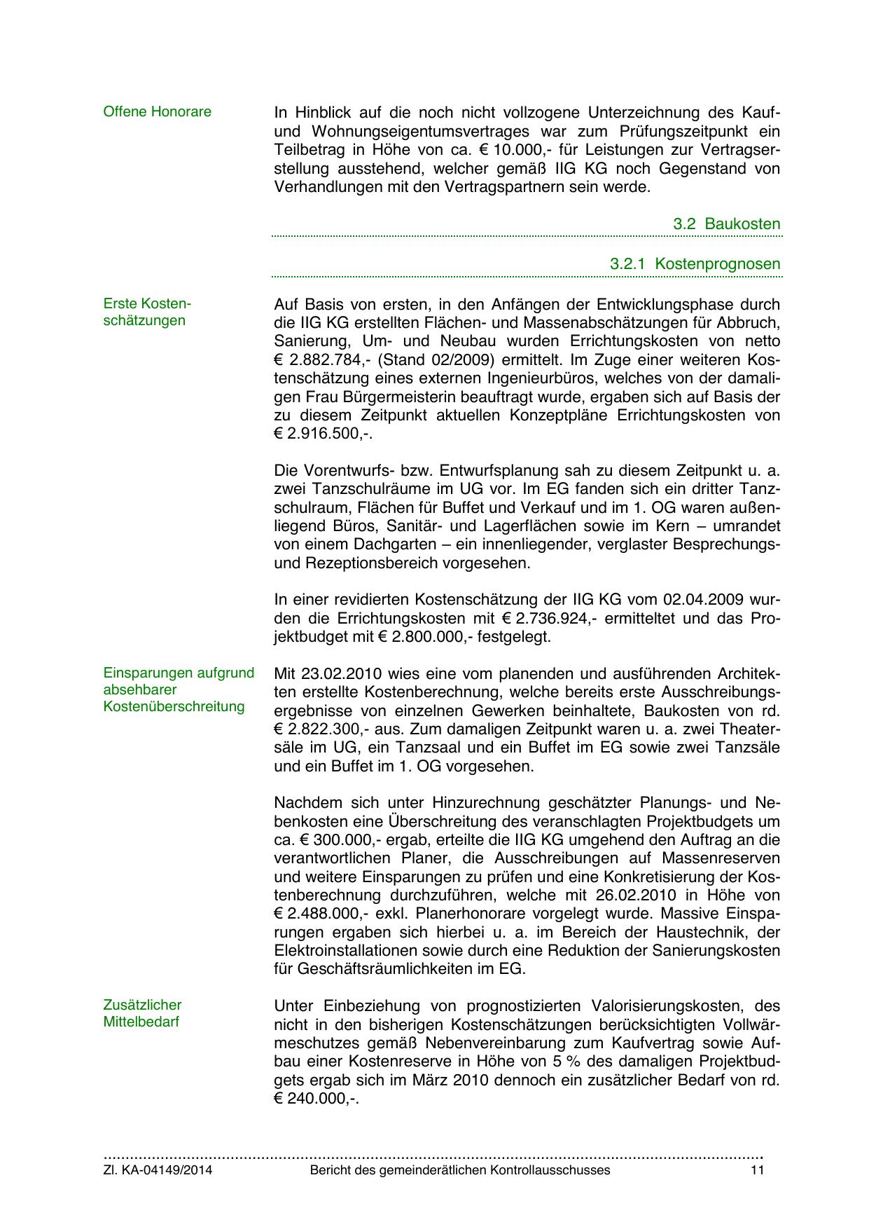 Mit 23.02.2010 wies eine vom planenden und ausführenden Architekten erstellte Kostenberechnung, welche bereits erste Ausschreibungsergebnisse von einzelnen Gewerken beinhaltete, Baukosten von rd.