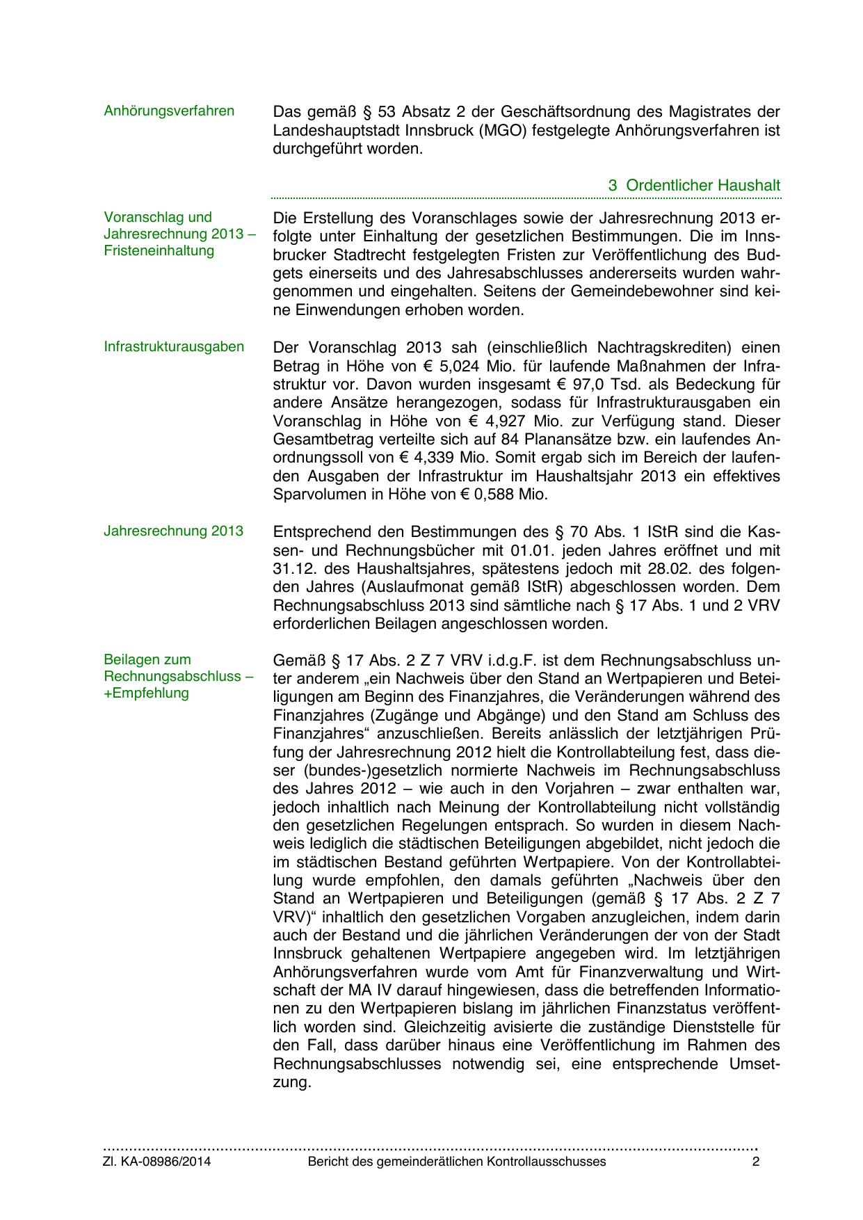 Die Erstellung des Voranschlages sowie der Jahresrechnung 2013 erfolgte unter Einhaltung der gesetzlichen Bestimmungen. Die im Innsbrucker Stadtrecht festgelegten Fristen zur Veröffentlichung des Budgets einerseits und des Jahresabschlusses andererseits wurden wahrgenommen und eingehalten. Seitens der Gemeindebewohner sind keine Einwendungen erhoben worden.