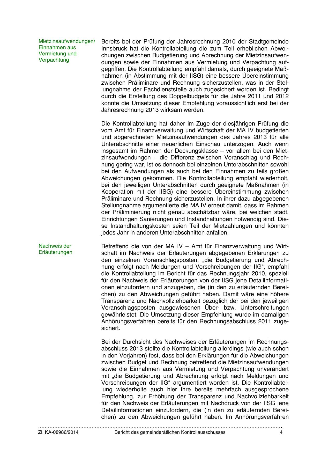 Innsbruck hat die Kontrollabteilung die zum Teil erheblichen Abweichungen zwischen Budgetierung und Abrechnung der Mietzinsaufwendungen sowie der Einnahmen aus Vermietung und Verpachtung aufgegriffen. Die Kontrollabteilung empfahl damals, durch geeignete Maßnahmen (in Abstimmung mit der IISG) eine bessere Übereinstimmung