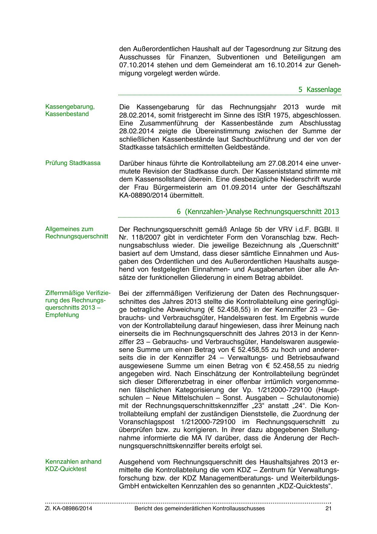 Ausgehend vom Rechnungsquerschnitt des Haushaltsjahres 2013 ermittelte die Kontrollabteilung die vom KDZ – Zentrum für Verwaltungsforschung bzw. der KDZ Managementberatungs- und WeiterbildungsGmbH entwickelten Kennzahlen des so genannten „KDZ-Quicktests“.
