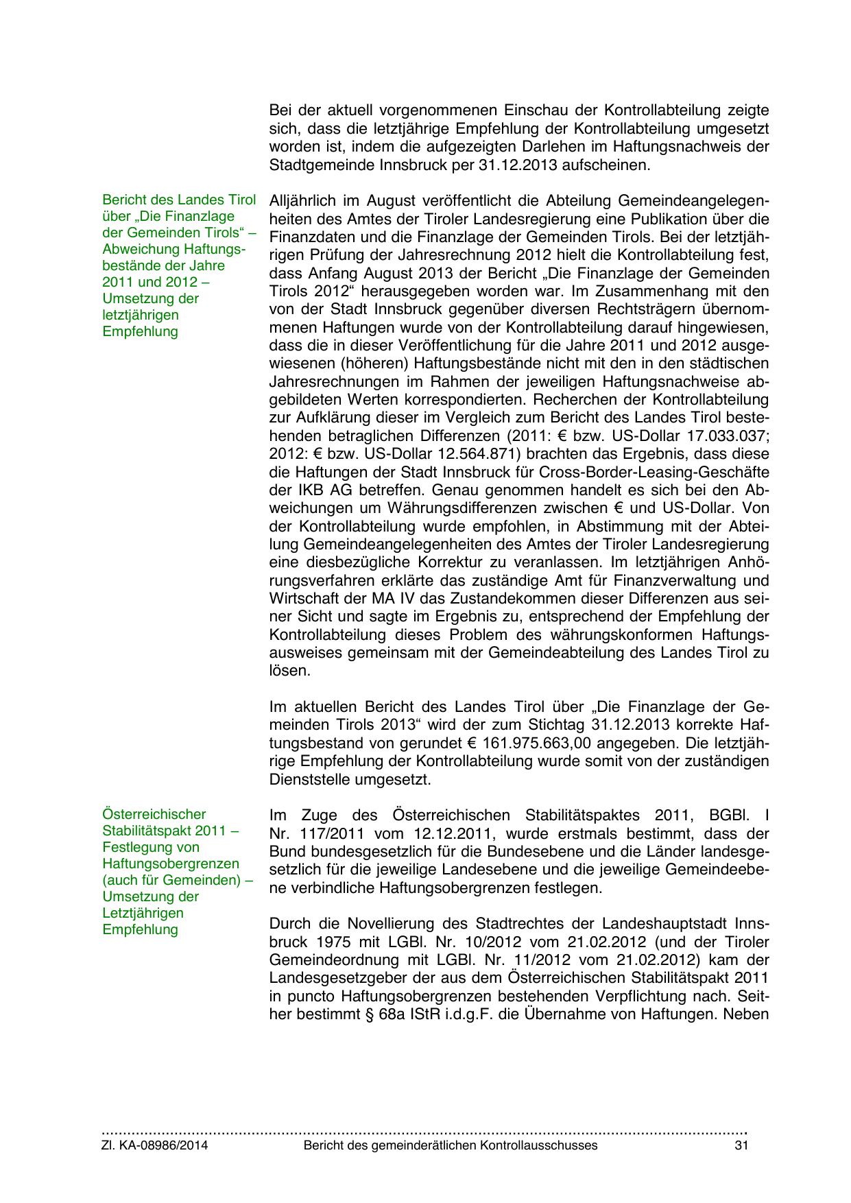 Im aktuellen Bericht des Landes Tirol über „Die Finanzlage der Gemeinden Tirols 2013“ wird der zum Stichtag 31.12.2013 korrekte Haftungsbestand von gerundet € 161.975.663,00 angegeben. Die letztjährige Empfehlung der Kontrollabteilung wurde somit von der zuständigen
