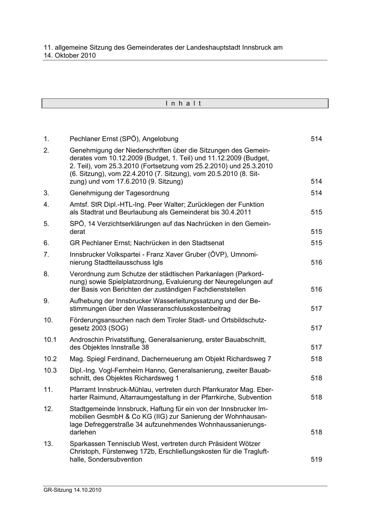 11. allgemeine Sitzung des Gemeinderates der Landeshauptstadt Innsbruck am