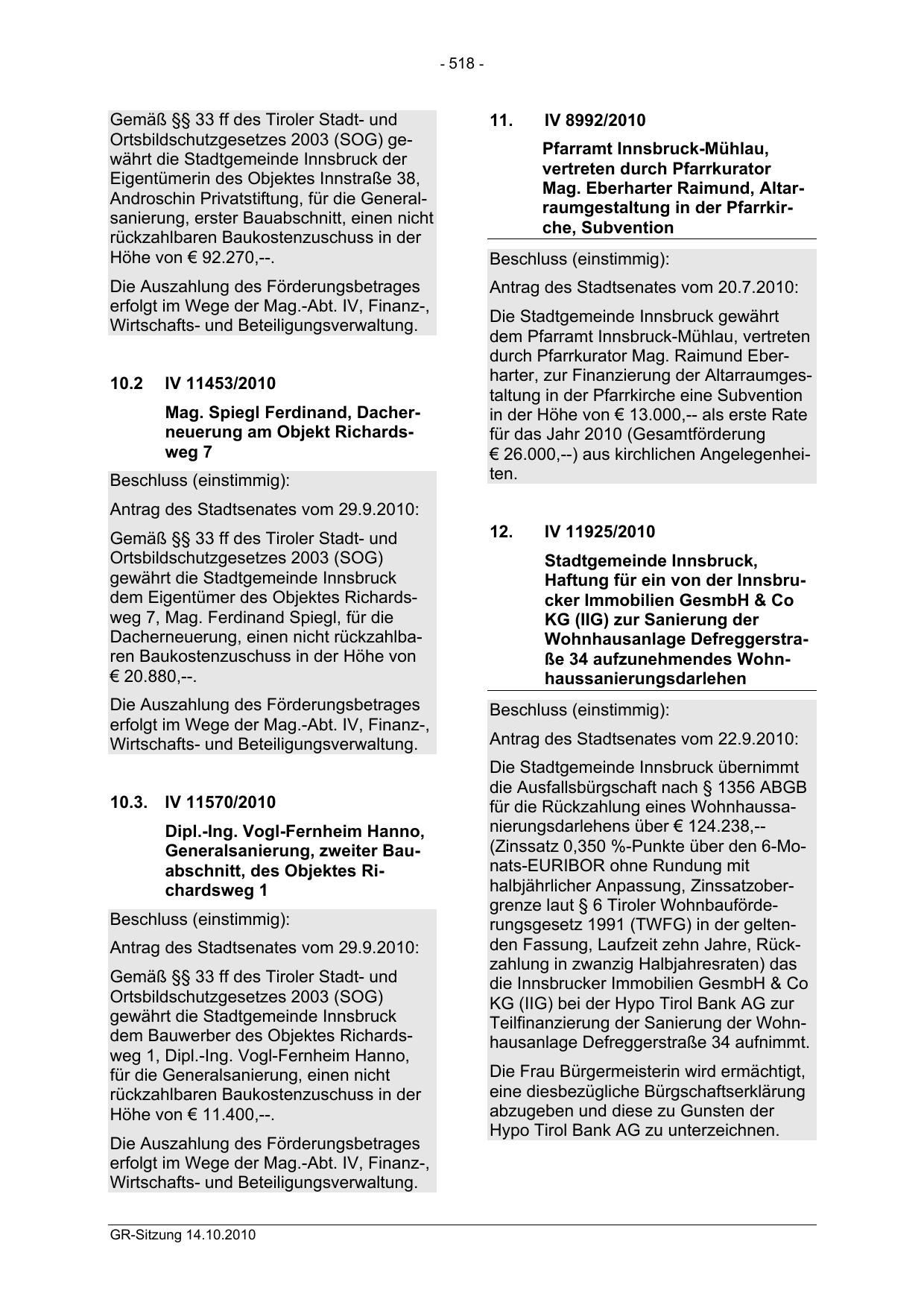 Ortsbildschutzgesetzes 2003 (SOG) gewährt die Stadtgemeinde Innsbruck der