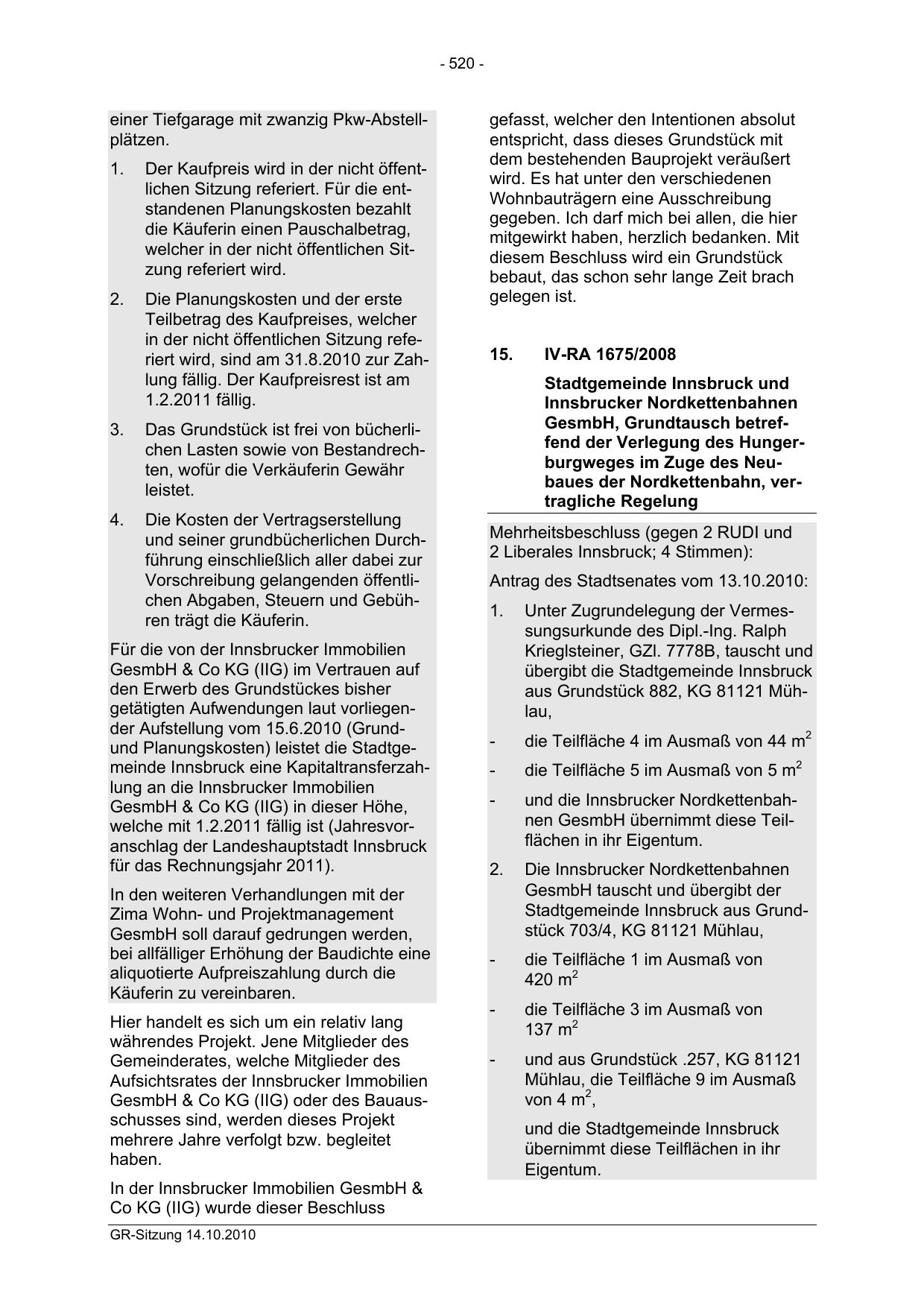 getätigten Aufwendungen laut vorliegender Aufstellung vom 15.6.2010 (Grundund Planungskosten) leistet die Stadtgemeinde Innsbruck eine Kapitaltransferzahlung an die Innsbrucker Immobilien