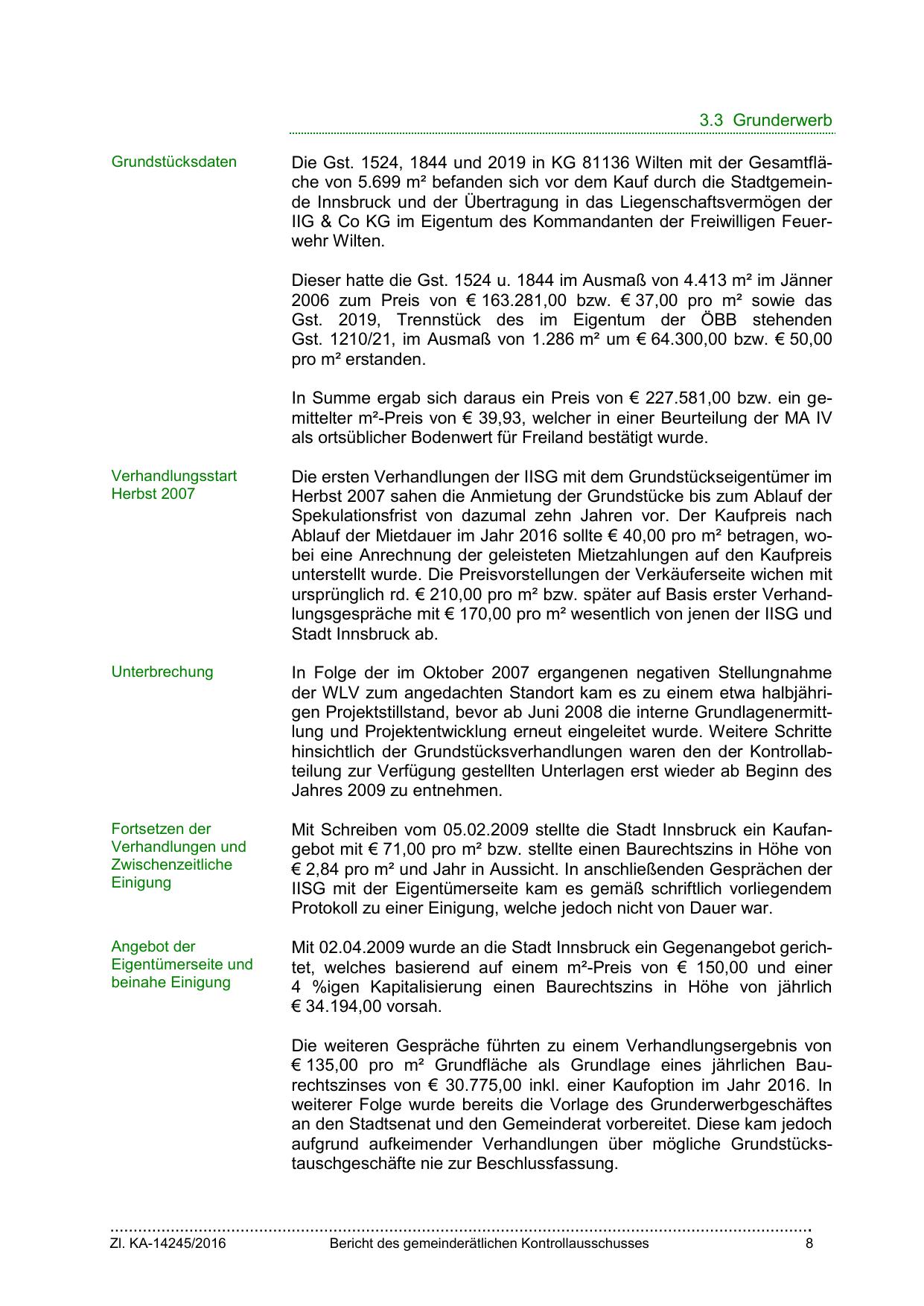 Mit 02.04.2009 wurde an die Stadt Innsbruck ein Gegenangebot gerichtet, welches basierend auf einem m²-Preis von € 150,00 und einer
