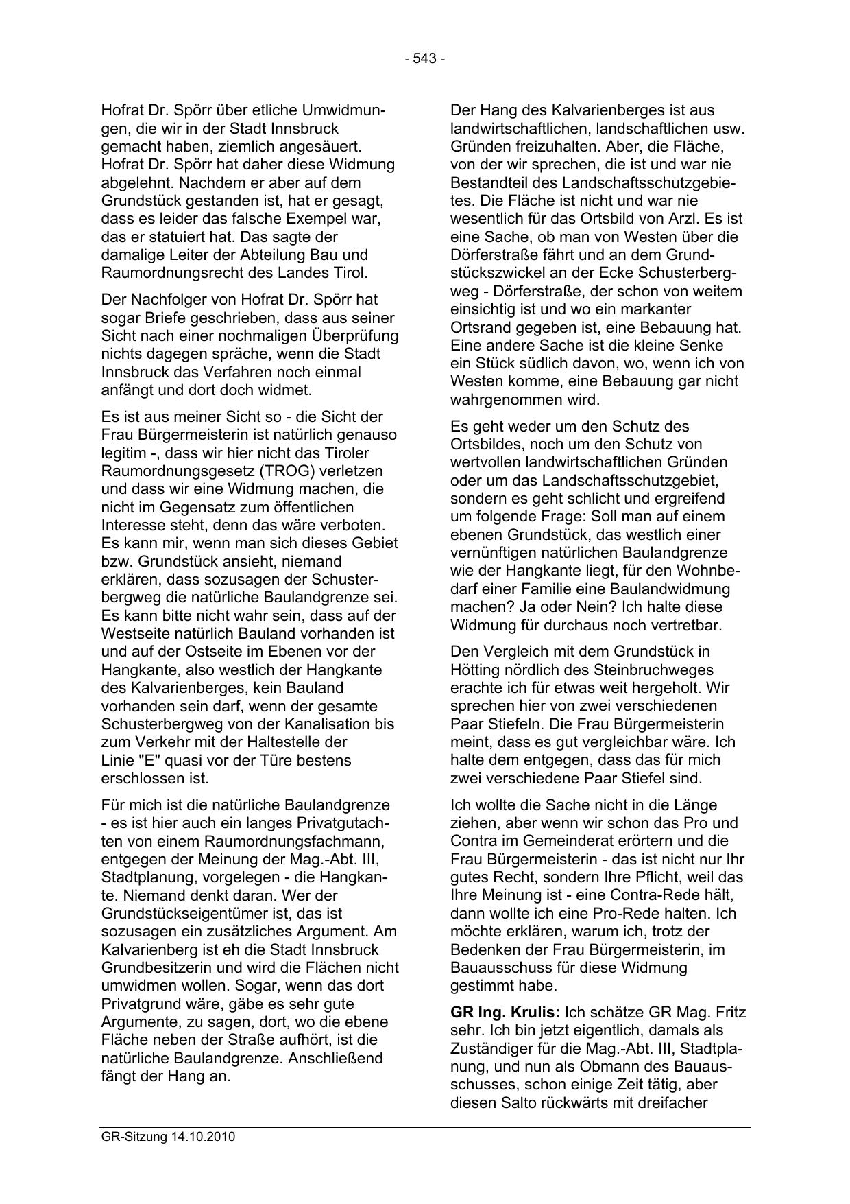 Hofrat Dr. Spörr über etliche Umwidmungen, die wir in der Stadt Innsbruck