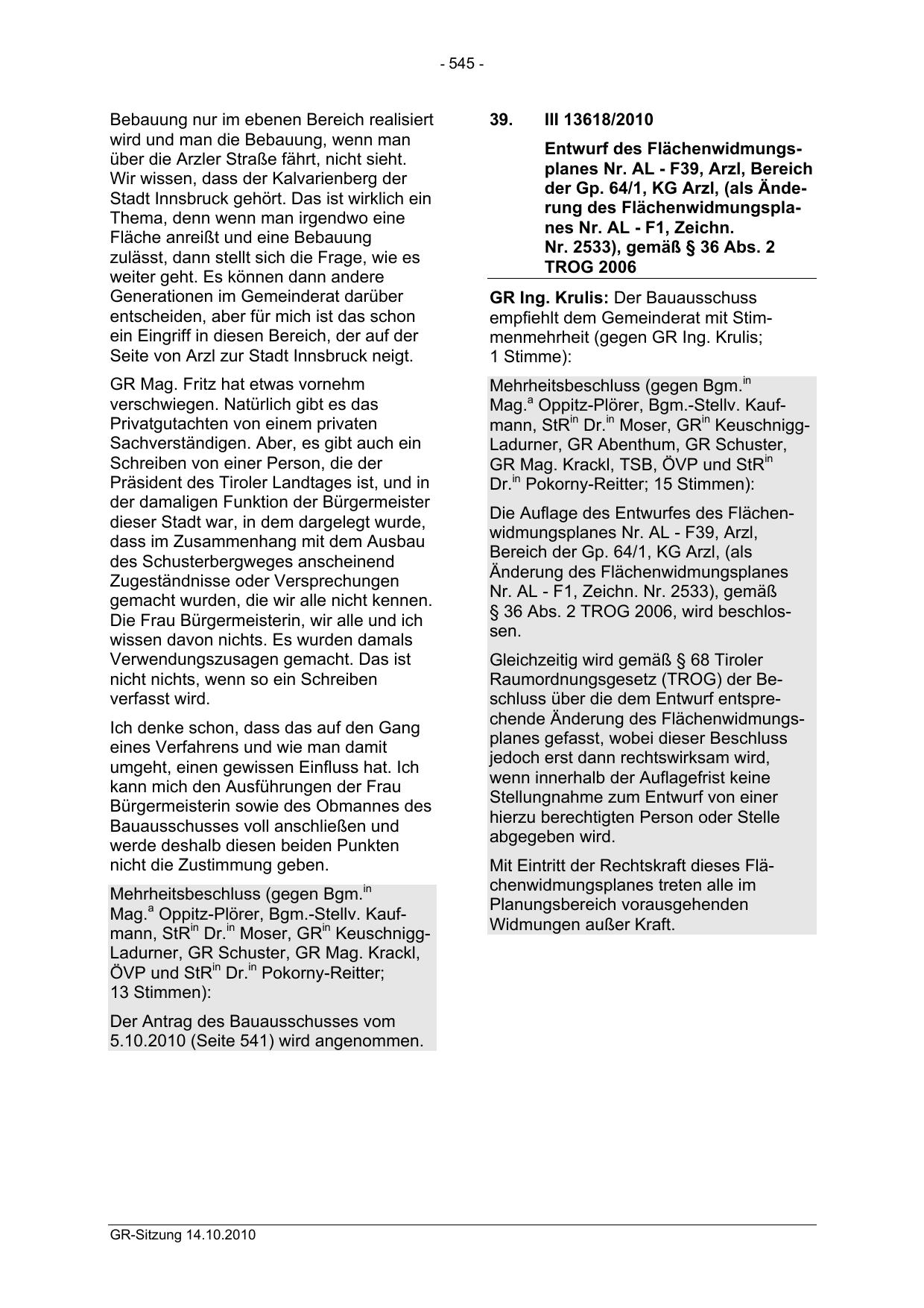 Raumordnungsgesetz (TROG) der Beschluss über die dem Entwurf entsprechende Änderung des Flächenwidmungsplanes gefasst, wobei dieser Beschluss