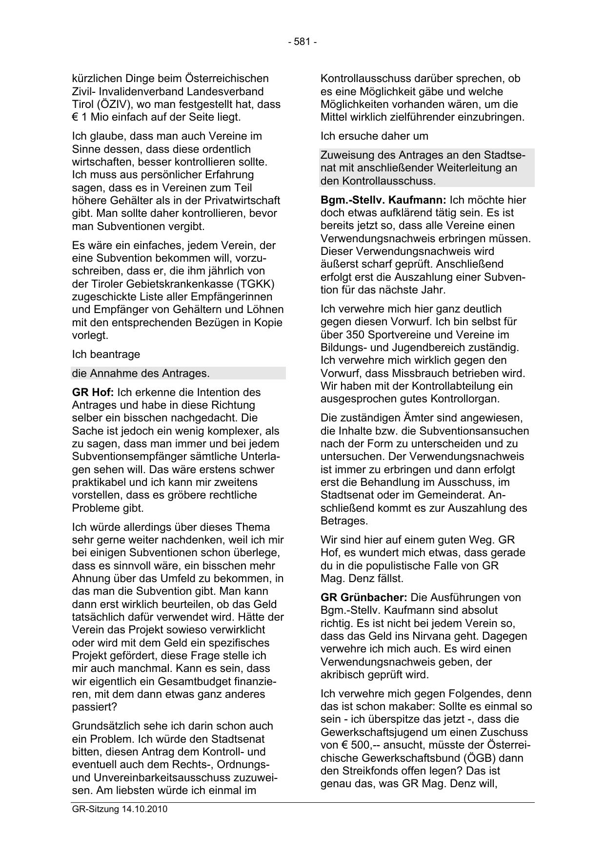 Stadtsenat oder im Gemeinderat. Anschließend kommt es zur Auszahlung des