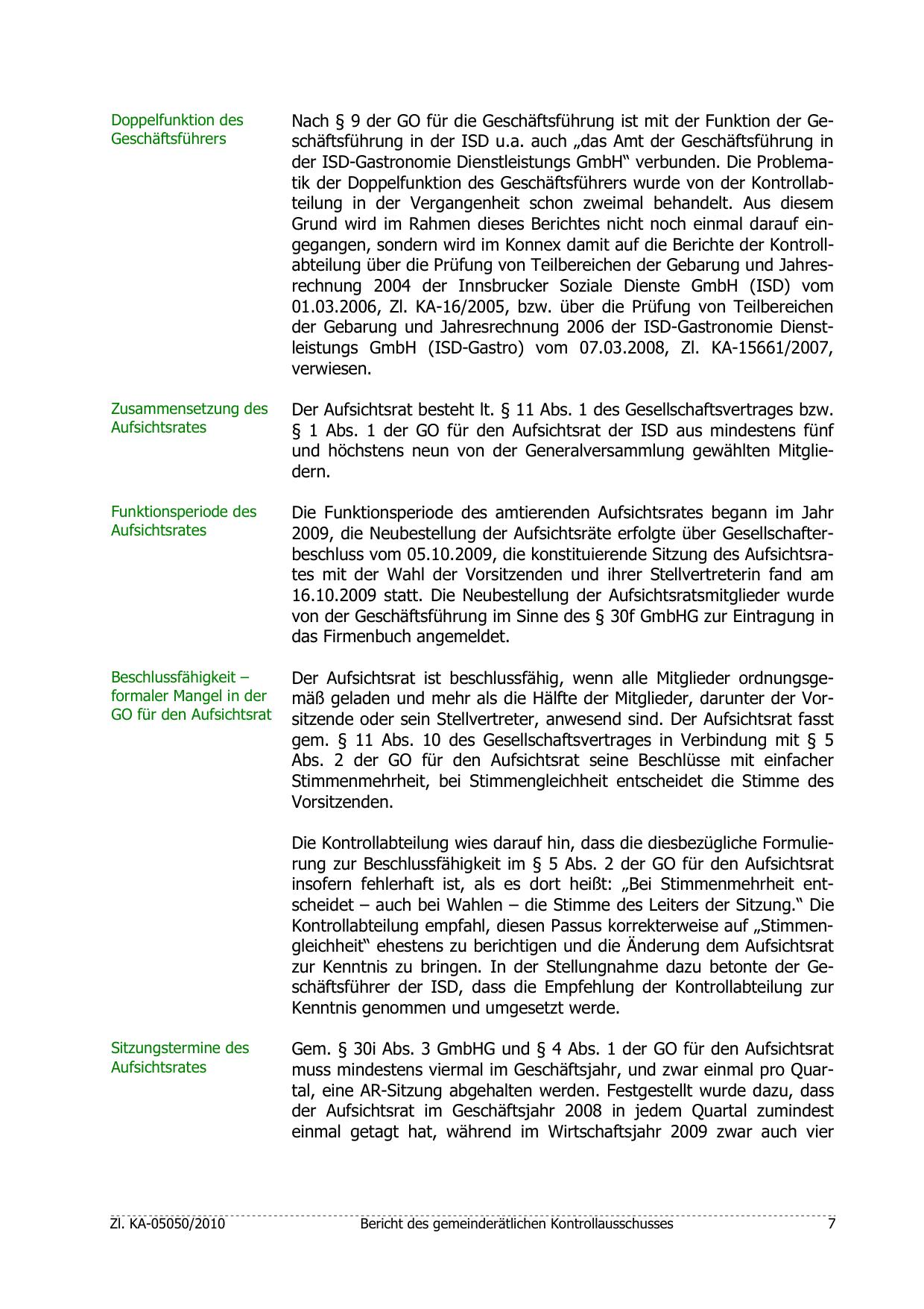 Grund wird im Rahmen dieses Berichtes nicht noch einmal darauf eingegangen, sondern wird im Konnex damit auf die Berichte der Kontrollabteilung über die Prüfung von Teilbereichen der Gebarung und Jahresrechnung 2004 der Innsbrucker Soziale Dienste GmbH (ISD) vom
