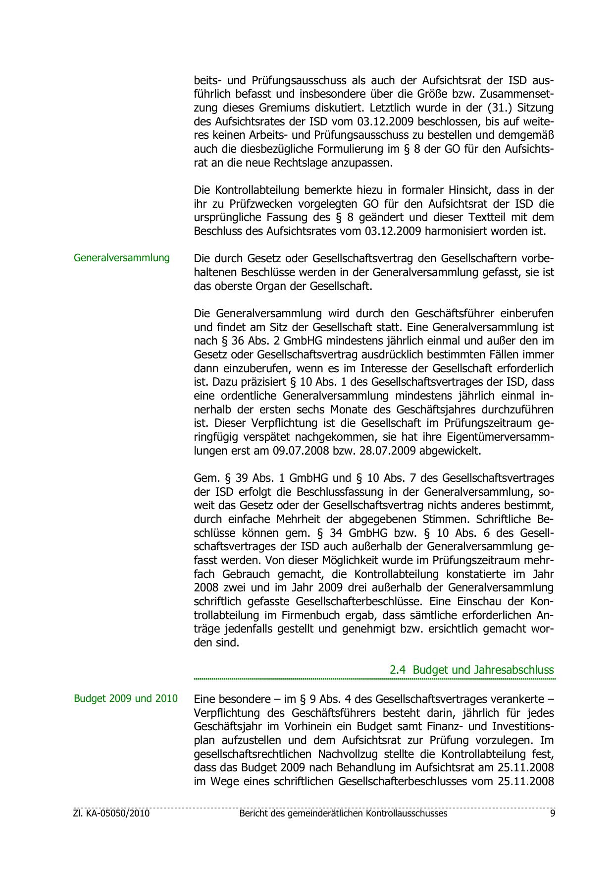 durch einfache Mehrheit der abgegebenen Stimmen. Schriftliche Beschlüsse können gem. § 34 GmbHG bzw. § 10 Abs. 6 des Gesellschaftsvertrages der ISD auch außerhalb der Generalversammlung gefasst werden. Von dieser Möglichkeit wurde im Prüfungszeitraum mehrfach Gebrauch gemacht, die Kontrollabteilung konstatierte im Jahr