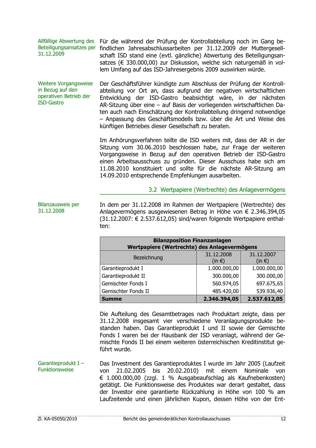 satzes (€ 330.000,00) zur Diskussion, welche sich naturgemäß in vollem Umfang auf das ISD-Jahresergebnis 2009 auswirken würde.