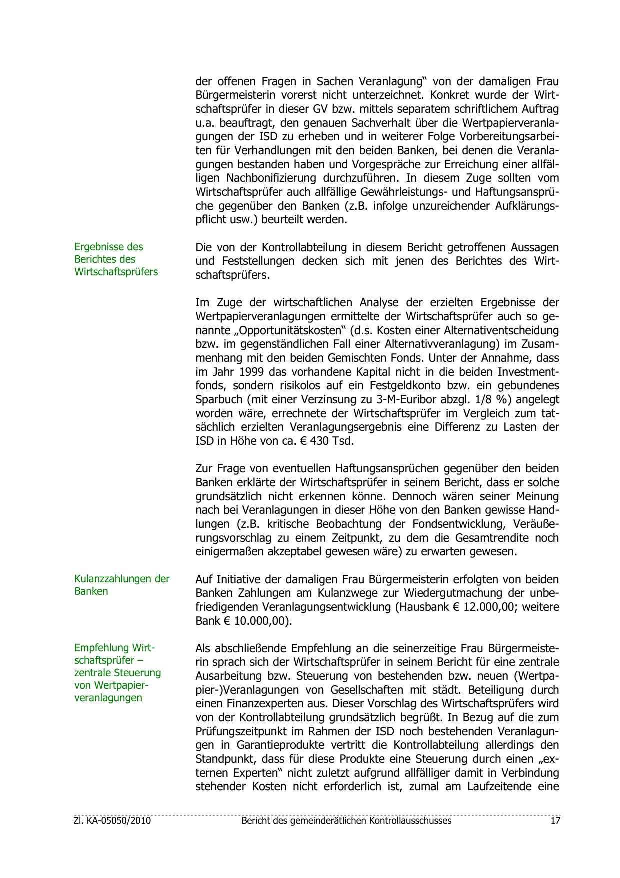 u.a. beauftragt, den genauen Sachverhalt über die Wertpapierveranlagungen der ISD zu erheben und in weiterer Folge Vorbereitungsarbeiten für Verhandlungen mit den beiden Banken, bei denen die Veranlagungen bestanden haben und Vorgespräche zur Erreichung einer allfälligen Nachbonifizierung durchzuführen. In diesem Zuge sollten vom