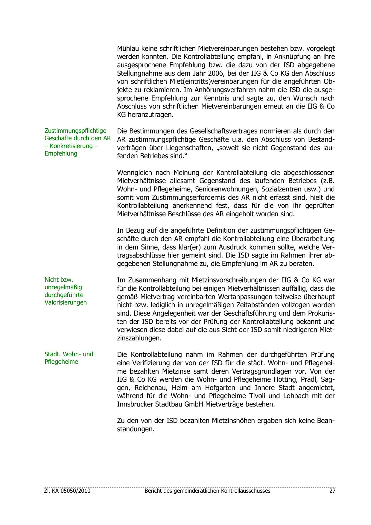 eine Verifizierung der von der ISD für die städt. Wohn- und Pflegeheime bezahlten Mietzinse samt deren Vertragsgrundlagen vor. Von der