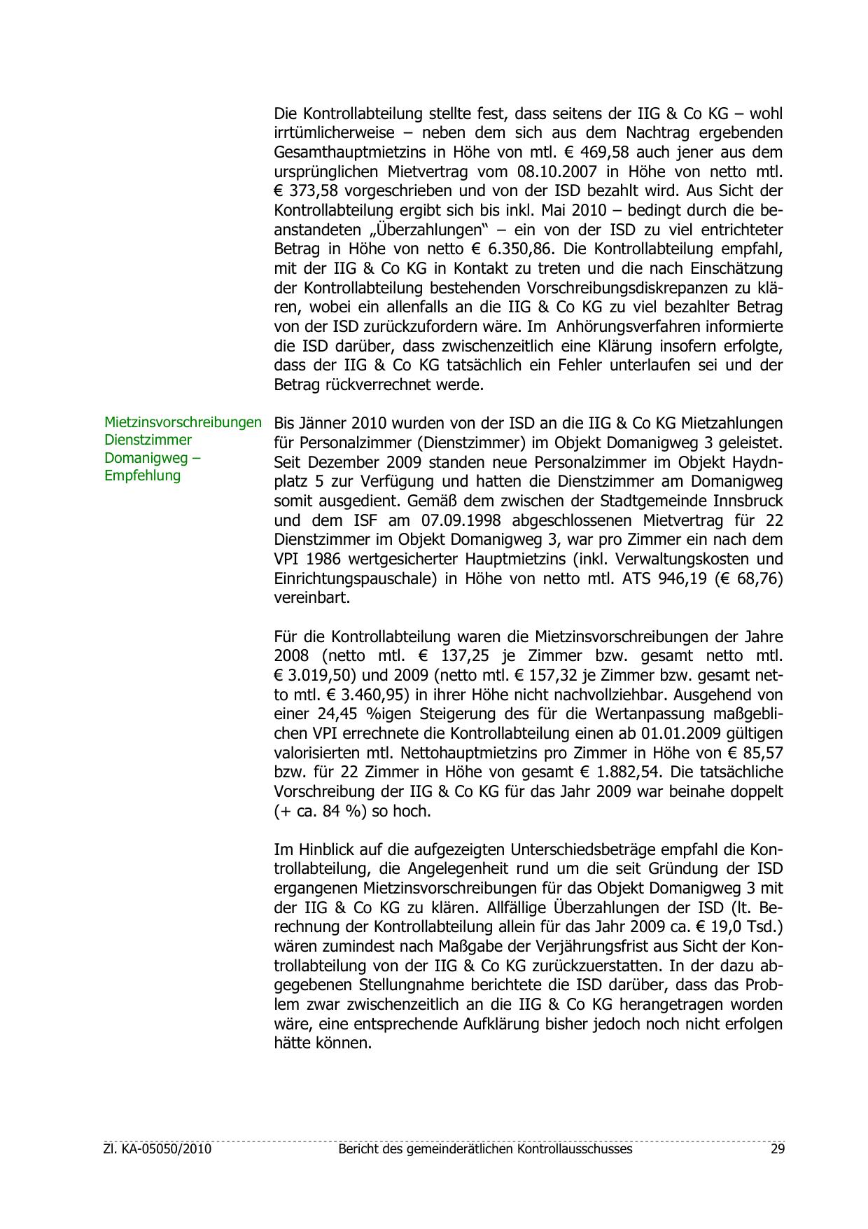 der IIG & Co KG zu klären. Allfällige Überzahlungen der ISD (lt. Berechnung der Kontrollabteilung allein für das Jahr 2009 ca. € 19,0 Tsd.)