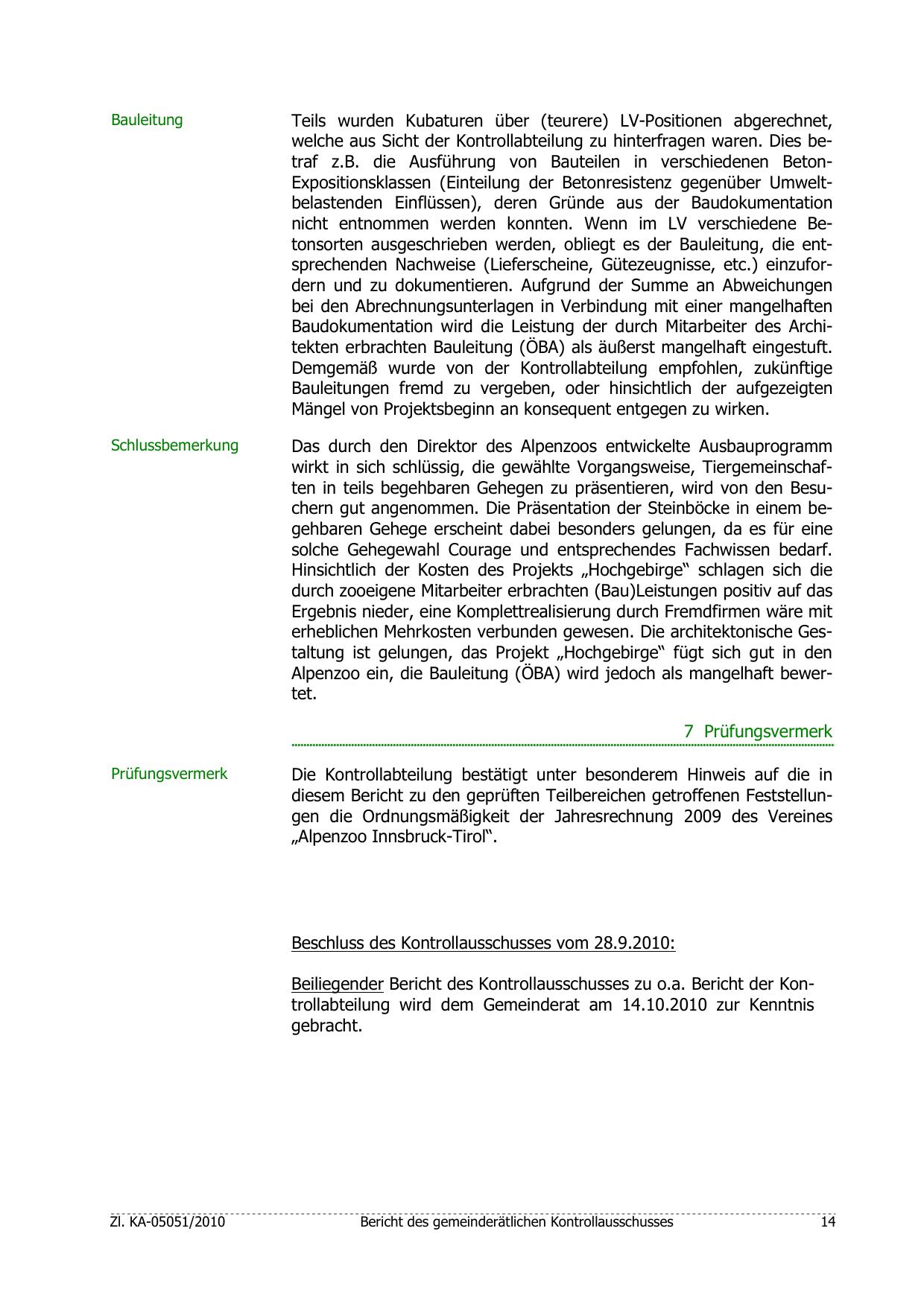 Alpenzoo ein, die Bauleitung (ÖBA) wird jedoch als mangelhaft bewertet.