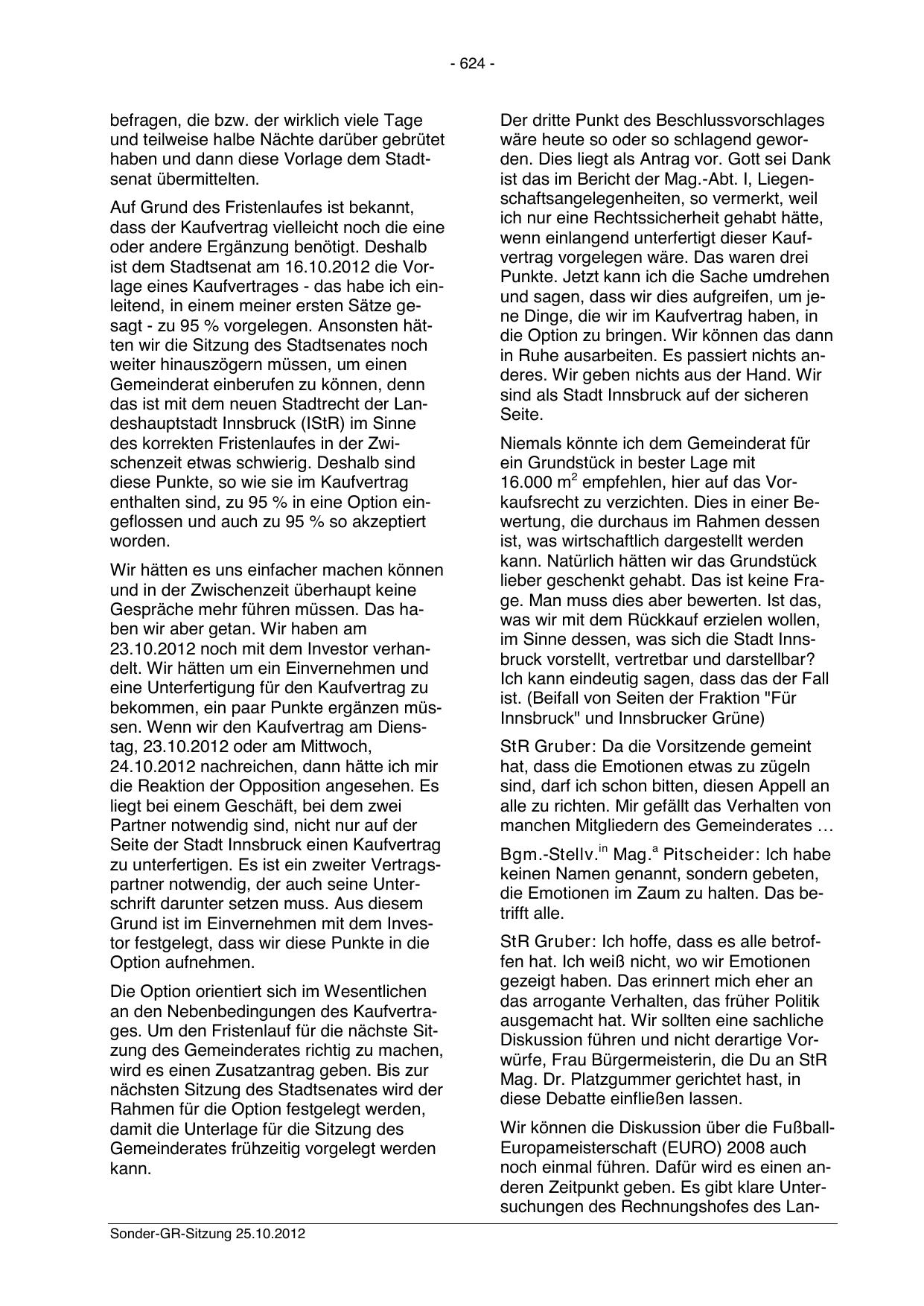 ist dem Stadtsenat am 16.10.2012 die Vorlage eines Kaufvertrages - das habe ich einleitend, in einem meiner ersten Sätze gesagt - zu 95 % vorgelegen. Ansonsten hätten wir die Sitzung des Stadtsenates noch